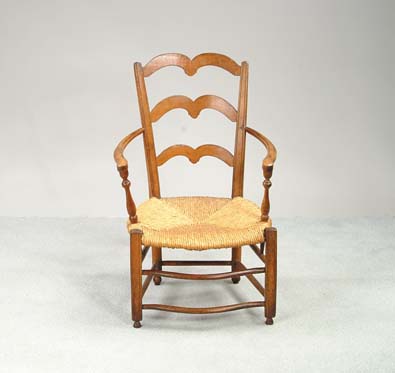 FRENCH ANTIQUE COUNTRY ARMCHAIR. Three shaped ladderback, tapered molded edge stiles, curving arms having turned arm supports. Double box stretcher, replaced rush seat, square molded edge front legs. SIZE: 33-1/2” h x 13” seat h. CONDITION: Insect damage, good. 12-12287 (250-400)