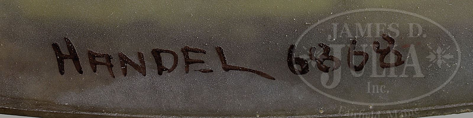 HANDEL BIRDS IN FLIGHT LAMP. Handel table lamp has obverse painted scene of birds in flight with a background of trees and meadows. Trees create five open areas in which the birds are flying. Decoration is all set against a chipped ice background. Shade rests on an oriental style Handel base with openwork foot and raised flowers, stems and leaves on the body of the base. All finished in a rich brown patina. Shade is signed on the interior bottom rim “Handel 6868” as well as artist’s initials “HB”. SIZE: Shade is 18″ dia. Lamp is 23-3/4″ t. CONDITION: Very good to excellent. 5-66898 (4,000-5,000)