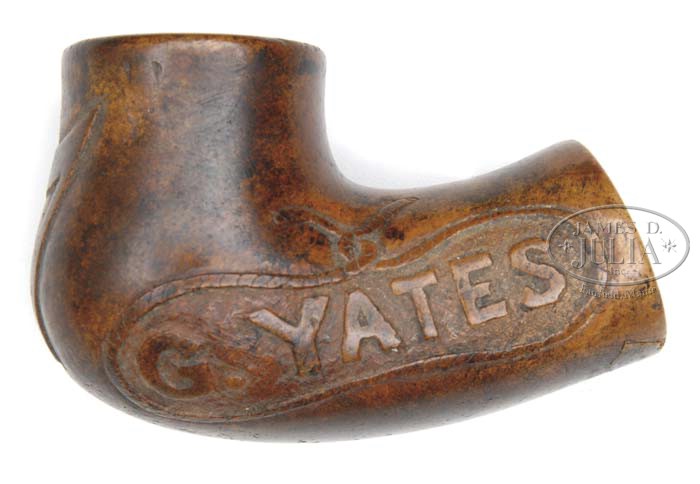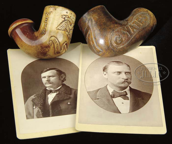 AN EXTRAORDINARY SINGLE OWNER COLLECTION OF IMAGES AND OBJECTS RELATING TO CUSTER, HIS 7TH CAVALRY AND THE INFAMOUS BATTLE OF THE LITTLE BIG HORN. (APPROXIMATELY 80 PIECES). The most infamous engagement of the U.S. military with Native Americans is unquestionably the battle that took place on the fateful day in June 1876 on the Little Big Horn river when Custer, and his entire command, were wiped out. This single owner collection, put together over a long period of time represents one individuals attempt to amass images and artifacts of as many of those troopers associated with the 7th Cav., during that time, as possible. Included are over 80 objects most of which are images, some exceedingly rare and difficult, if not impossible, to find today. 1) A BOLD AND DRAMATIC CARVED CLAY PIPE BOWL FORMERLY BELONGING TO CAPT. GEORGE YATES KIA. This massive and wonderful pipe bowl is carved in relief on all sides. The frontis of the bowl with a large seraph relief “7” for the famous 7th Cav. On the right side of the bowl, in relief and in an oval is “G.Yates”. On the reverse, in relief is a horseshoe with “F Co.” This large and boldly carved pipe is an impressive piece with a deep, dark, rich brown patina that was developed from years of handling and use out on the plains while Yates was with the 7th. Capt. George Wilhelmur Yates was born in Albany. NY in 1853. He served in the Civil War and in June of 1867 George Custer arranged for his transfer into the 7th Cav as Captain of Company F. Capt. Yates was with the 7th at the Battle of Washita in 1868; participated in the Reconstruction until around 1873; went out West to participate in the Yellowstone Expedition of 1873; later the Black Hills Expedition of 1874 & 1876. It was in June of 1876 that he was in command of Com. F under Gen. Custer at the Little Big Horn when the entirety of the command met their demise. SIZE: Pipe bowl measures approx. 4-1/2” l x 3” h x nearly 2” in diameter. CONDITION: Has one ancient chip on upper outside rim of bowl, obviously from its period of use as evidenced by the wonderful patina present. A small, re-glued chip on underside of bowl near where the stem would enter. 2) LARGE CABINET CARD OF CAPTAIN YATES IN CIVILIAN DRESS. Capt. Yates with his classic mustache and goatee. SIZE: Approx. 4-14”w x 6-1/2”h. CONDITION: Generally excellent. 3) LARGE WELL CARVED MEERSCHAUM PIPE BOWL OF CAPT. THOMAS BENTON WEIR. This marvelous folk art carved pipe is carved on all three sides. The front, a large and bold relief spread-winged American eagle with a shield belly clutching olive branches and arrows in its talons and a banner in its beak “E Plubirus Unum”. Beneath the eagle is another banner “7th Regiment U.S. Cavalry”. On the left side of the pipe bowl, carved in relief, is “Company D” for Weir’s Company and on the right side, also carved in relief is his name “Weir”. With its orig, velvet lined protective leather case is in outstanding condition and exhibits a fabulous patina. The white clay Meerschaum’s patina has turned a light, creamy amber color on the bowl and the back of the bowl with the stem hole has a rich, dark, almond brown patina. The pipe exhibits much use and obviously was smoked by Capt. Weir while on campaign. There is no stem. Captain Thomas Benton Weir was born in Ohio in 1838 and attended the University of Michigan. He served in the Civil War and was promoted to Lt. Col. For his services in battle against Nathan Bedford Forrest. He was also involved with Reconstruction in Texas and served on the staff of Gen. Custer. Capt. Weir had a bumpy tenure of service in the military and on more than one occasion came close to discharge. On that fateful day in 1876 he was in command of Co. D and assigned to Benteen’s battalion. He and Benteen arrived too late to assist Reno in his fight, but at the time of arrival Weir could hear the battle raging in Custer’s direction. Though he had no orders at that time and while the rest of the battalion was hesitant Weir set off, with his Company, in Custer’s direction in hopes of providing support. He was eventually forced by attacking Indians to turn back. The furthest point that he managed to advance to before being turned back is now referred to as “Weir’s Point”. Weir survived the battle but in December of that same year he died in New York. SIZE: Approx. 3-1/2”l x 3” x 1-3/4” diam. CONDITION: Very good. 4) LARGE CABINET CARD OF CAPT. THOMAS BENTON WEIR. Signed on the reverse, “Yours T.B.Weir, Captain U.S.Cav.” SIZE: 4-1/4”w x 6-1/2”h. CONDITION: Very slightly toned. Generally excellent. 5) LARGE CABINET CARD OF GENERAL GEORGE ARMSTRONG CUSTER IN CIVILIAN ATTIRE KIA. Custer was born in 1839 in New Rumley, Ohio. He was the first of five children. He entered West Point in 1857 and did very, very poorly as a student, in fact, last in class ranking. Fortunately for him the Civil War created a great demand for officers, even ones at the bottom of their class. He truly distinguished himself at Gettysburg where he led his four regiments of Michigan Cavalry on June 28th, 1863. Three days prior to the Battle of Gettysburg, General Pleasanton promoted Custer from Captain to Brigadier General of Volunteers and as a result of his former bravery and fearlessness in engagements, became one of the youngest Generals in the Union Army at 23. On July 3rd at Gettysburg, Custer once again distinguished himself in multiple fearless charges with his 1st Michigan cavalry which eventually broke the back of the Confederate assault on the West side of the line. Custer was brave, arrogant, showy, calculating and fearless as a leader, as such his actions alienated him form some of his commanders and he was dismissed from the military for a period of time but managed to regain his commission through the help of various commanders who admired him. In June of 1876, while operating under Brigadier General Terry, he discovered an encampment