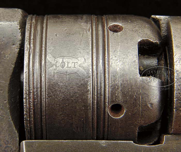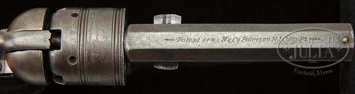 COLT NO. 3 BELT MODEL PATERSON PERCUSSION REVOLVER. SN 552. Cal. 34. Usual configuration with 3-1/2″ oct bbl, brass pin front sight and usual Patent Arms marking. It has 5-shot cylinder with rounded shoulder that is rolled with the Centaur scene. Grip has flared butt with a 1-pc bird’s eye maple grip. Serial number was noted on the rear face of bbl lug, on the wedge, rear face of cylinder, cylinder rotating ring, right side of front strap under the grip, inside back strap and in the butt strap channel of the grip. According to Flayderman’s Guide to Antique American Firearms there was a combined total production of about 850 of the No. 2 & No. 3 Belt Model Patersons produced in the period 1837-1840. CONDITION: About good. No orig finish remains being mostly a cleaned & artificially aged patina with scattered fine pitting on the bbl, bbl lug, cylinder & sides of recoil shields. Frame & grip frame are a smooth artificially aged patina. Cylinder retains about 50% Centaur scene. Grip has a repaired chip on left side at the frame, otherwise is sound and retains about all of a fine restored finish. Mechanics are fine, strong bore with moderate pitting. 4-45113 (40,000-60,000)