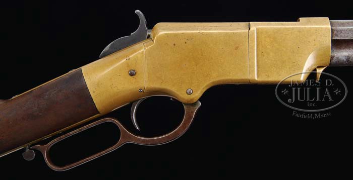 EARLY HENRY LEVER ACTION RIFLE. SN 4433. Cal. 44 RF. 24-1/4″ oct bbl with integral full length mag tube. nickel front sight blade, standing semi-buckhorn “V” notch rear sight, left side troth, mounted with screwed on sling loop. Top flat of bbl is marked “HENRY’S PATENED.OCT.16. 1860/MANUFACT’D BY THE NEW HAVEN ARMS CO. NEW HAVEN CT.” Standard Henry brass receiver, mounted with straight grain walnut, no forend, uncheckered straight grip stock, brass rnd heel buttplate with trap door, retaining 4-piece iron and brass wiping rod, inlet sling swivel base on left side with visible Henry bump. Inspection of lower tang finds matching serial number to bbl, with matching number in top tang of stock, inside toe of buttplate, and both of the buttplate screws. CONDITION: Fine. Bbl is a silver patina mixed with much scattered brown patina and minor shallow surface pitting. The bbl address and serial number on top flat are very legible. Follower, spring and collar are all in good working order. The brass frame retains a yellow mustard patina with sharp edges, minor nicks and scratches and some slight battering along top of left plate. Hammer retains a dark patina finish with some minor silvering, lever and latch are a brown and silver patina mix. Stock is sound with some usual nicks & scrapes, handling marks, a visible Henry bump below swivel on left side, there also appears to be a small amount of orig varnish, but retains mostly an open grain, hand worn patina finish. Mechanics are good with a dark pitted bore. 4-37378 BDT118 (15,000-25,000)