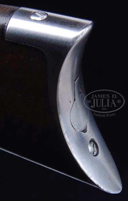 RARE HALF-SCALE MICHAEL BARRETT IRON FRAME HENRY RIFLE. SN NSN. Cal. NONe. One of only four of these tiny rifles built by Michael J. Barrett of Forest Lake, MN. It is built precisely to 1/2 scale with a 12-1/2″ oct bbl, integral magazine, brass blade front sight, brass follower & carrier with a Henry style ladder rear sight in the bbl dovetail and, like the orig, a second dovetail toward the top rear of the receiver. Lever is made without latch. Integral magazine tube & bbl were made from a sgl pc of bar stock, which when finished left a large opening on the bottom – too large for the follower. Mr. Barrett created a rolling wheel to form the lips of the tube to the correct opening. All of the miniature makers make the tube & bbl in two pcs and weld them together. This rifle has a very highly figured tiger-striped rosewood stock with iron crescent buttplate with trap. Lower tang is marked with Mr. Barrett’s initials. Bbl is not rifled or chambered and there is no firing pin and is not an actual firearm, otherwise the mechanics function exactly like the orig. Rear sight is purposely made with a crack in the bottom center to provide tension for the slide. CONDITION: Extremely fine. Metal is bright showing a few minor handling marks. Wood is sound & retains a fine oil finish. A truly rare & very decorative item that would complement anyone’s Henry collection. 4-33771 JR314 (2,750-3,500)