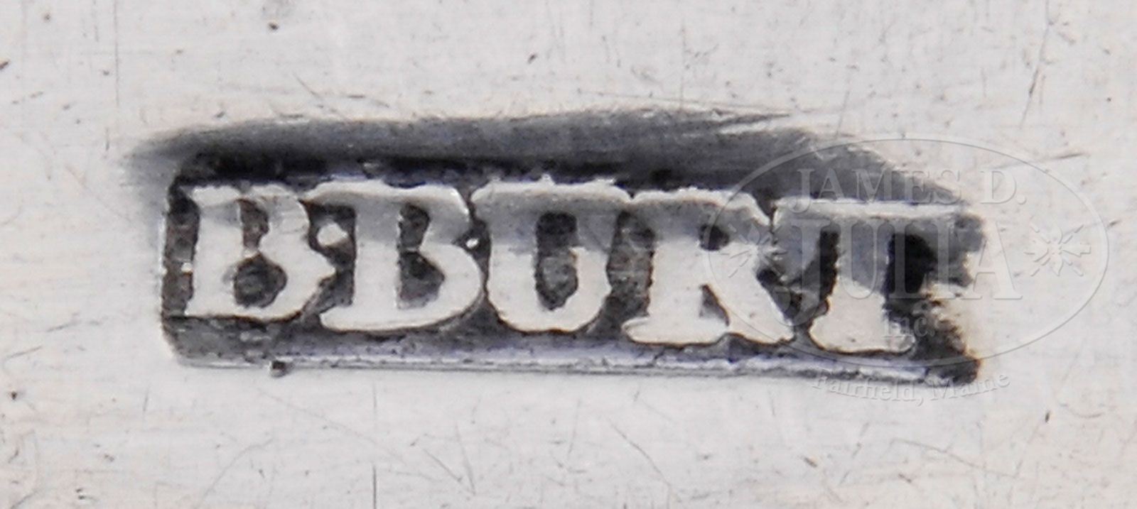 9-1/2″ COIN SILVER SPOON BY BENJAMIN BURT OF BOSTON, MA. The spoon marked “B BURT”. The front decorated with cut-work bellflowers and an elongated oval with monogram “I L D”. WEIGHT: 1.9 tr. oz. SIZE: 9-1/2″ CONDITION: Very good. 9-25895 (400-700)