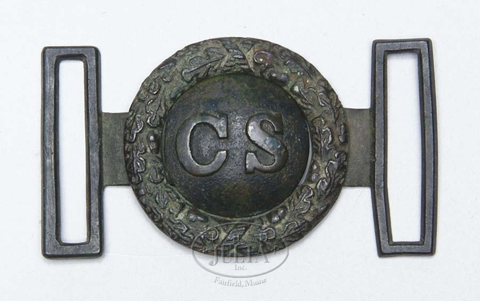 CONFEDERATE “CS” 2 PIECE WAIST BELT PLATE. This is a fine example of a scarce western theater two-piece Confederate buckle. Letter of authenticity accompanies from Steve Mullinax stating buckle was found near Murfeesboro, Tennessee. Buckle is in fine condition. 4-56275 JS125 (2,000-3,000)