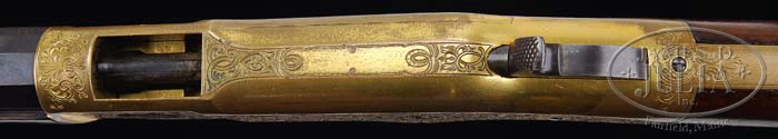 RARE DELUXE CONRAD ULRICH ENGRAVED EARLY WINCHESTER MODEL 1866 LEVER ACTION RIFLE. SN 36259. Cal. 44 RF Henry. Beautiful ’66 with 24-1/4″ oct bbl, German silver Rocky Mountain front sight and Henry 900 yard ladder rear sight. It has sharp Winchester & King’s improvement bbl markings. Mounted with very highly figured, uncheckered, burl walnut with straight stock & crescent brass buttplate with trap. Forend cap is the early type with dimples in front edges and a factory installed sling swivel with corresponding swivel in buttstock. Receiver is spectacularly & unusually engraved by Conrad F. Ulrich and signed with his initials just behind trigger. Engraving consists of intertwined deep foliate arabesque patterns on left sideplate and rear edge of frame with a cross like central medallion. Front stepped area of left side has matching engraving patterns with central medallion of an African bull elephant. Right side is engraved to match with a charging lion in front stepped area and a standing bull elk on sideplate. Top of receiver, top tang & carrier, along with forend cap & buttplate tang are engraved to match. Left side of lower tang, under the wood is marked “XXX” along with a “G” and an engraved “4”. Top tang channel of buttstock is stamped with matching serial number, last four digits of which are inside toe of buttplate. This is one of the finer ’66 rifles to come to market in recent memory. CONDITION: Very fine plus, all matching. Bbl retains 60-70% orig blue turning brown over top, strong & bright in sheltered areas. Magazine tube retains about 80-85% strong orig blue. Receiver retains 15-20% orig gold plating on left side and about 30% on right side with about 70% on bottom & top. Forend cap retains about 70% strong orig gold plating and buttplate about 30%. The exposed areas are all a dark mustard patina. Lever retains traces of case colors and the hammer about 70-75% dark case colors. Trigger retains a strong blue. Wood is sound with minor nicks & scratches and retains about all of a beautiful professionally restored finish. Mechanics are crisp, strong bore with good shine and moderate pitting. 4-35292 JR296 (70,000-100,000)