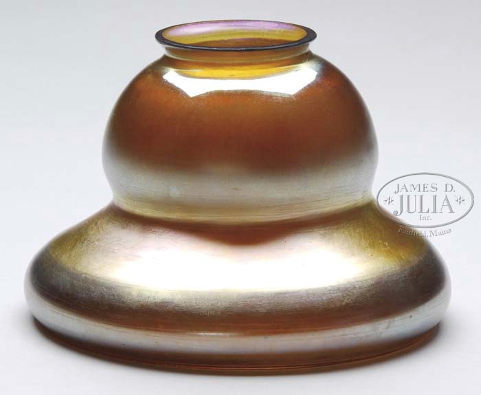 TIFFANY STUDIOS BELL SHADE. Bell shape shade of gold favrile glass has a very nice iridescent finish showing pinks, blues and greens. Signed “L.C.T.”. SIZE: 2-1/4″ fitter x 5-1/2″ dia. CONDITION: Very good to excellent. 5-61516 (1,000-1,500)