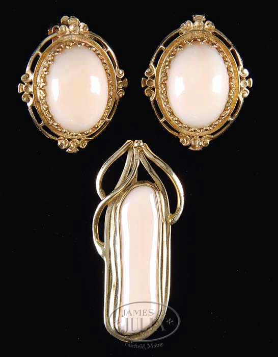 14KT GOLD & CORAL EARRINGS AND PENDANT. Beautiful 14kt yellow gold earrings are set with 14x18mm oval coral cabochons. Pendant has a 14kt yellow gold openwork frame with a large freeform polished pink coral stone. All pieces are signed on the back “14k”. SIZE: Pendant is 1-3/4″ l. Earrings are 1-1/8″ x 7/8″. PROVENANCE: From the Estate of Geraldine Gaba, Scottsdale, AZ. CONDITION: One earring is missing clip back, otherwise very good to excellent. 5-68344 (100-300)
