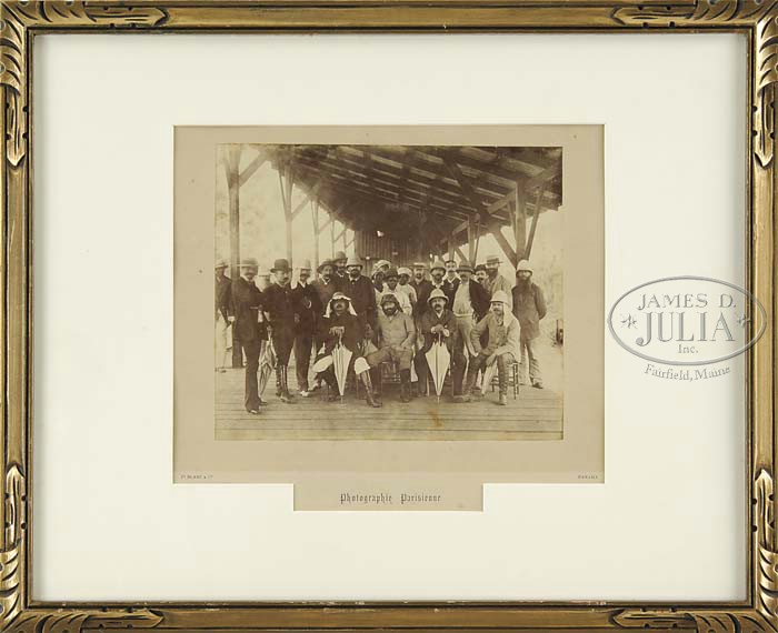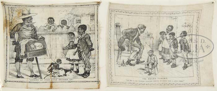 LARGE LOT OF OLD PHOTOS AND PRINTS. Nice grouping of early black and white images, many featuring African Americans. Included is a yardlong tinted photo print poster entitled “White Cotton, Black Pickers, and a Gin”, tinted photo of black youths betting and throwing dice, two cotton handkerchiefs with racially insensitive imagery, Old West downtown scene photo, portrait of men in pith helmets entitled “Photographic Parisienne”, old photo of a horse drawn gig, a large outdoor lumber mill scene, large poster from the South African Government Office showing downtown Johannesburg in its original frame, and more. SIZE: Varies. Largest is 41″ l x 31″ h. CONDITION: Generally good. 1-10858-15 (400-600) Auction: Advertising, Toy & Doll - Spring 2011 Please Note: All prices include the hammer price plus the buyer’s premium, which is paid by the buyer as part of the purchase price. The prices noted here after the auction are considered unofficial and do not become official until after the 46th day. |