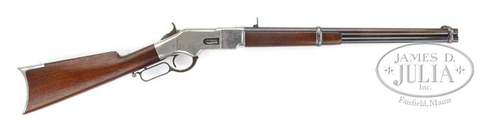 WINCHESTER MODEL 1866 SRC WITH NICKEL TRIM. SN 45125. Cal. 44 RF. 20 rnd bbl, full mag, neatly crafted modified front sight with Rocky Mountain blade, neatly crafted modified 2-leaf carbine rear sight. Standard Model 66 receiver with staple and saddle ring on left side, mounted with nicely figured straight grain walnut, uncheckered forend with single retaining band, uncheckered straight grip stock, brass crescent buttplate with trap door. The receiver and buttplate are nickle finished. Inspection of lower tang reveals the stamped letter “C” in top tang channel of stock and inside toe buttplate have matching numbers to the Serial No. 5125. CONDITION: Fine. Bbl retains strong orig blue in protected areas with balance blending with a brown and silver patina. Mag tube retains most of a blue gray patina finish. The brass receiver retains 80-85% nickle, thinning on sharp edges, center of left plate, and marks from the saddle ring. Stock is sound with some minor nicks & dings a couple shallow dents on left side near frame and retains an open grain oil finish. Forend is sound with typical nicks & dings and retains an open grain oil finish with hand worn patina. Mechanics are crisp, very nice bore with strong rifling and a few minor scattered shallow pits. 4-36321 BDT209 (5,000-8,000)