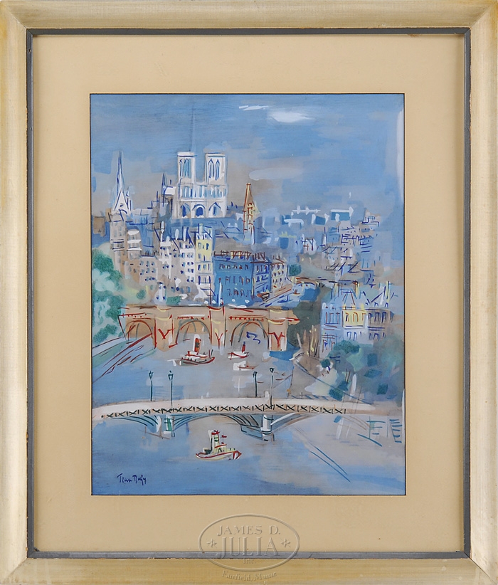 JEAN DUFY (French, 1888-1964) “PARIS, ISLE DE LA CITE”. Large gouache highlighted print showing a waterway with bridges and large buildings. A birdseye view of Paris. Signed lower left. Housed in what appears to be its original white and gray painted frame with white matte. Back having a partial label from the New York Graphics Society with artist and title. SIZE: Sight: 23″ x 18″. PROVENANCE: From a private Rangeley, Maine home. CONDITION: Very good. The piece is glued to the matte with a backing board. 9-95003 (2,000-3,000)