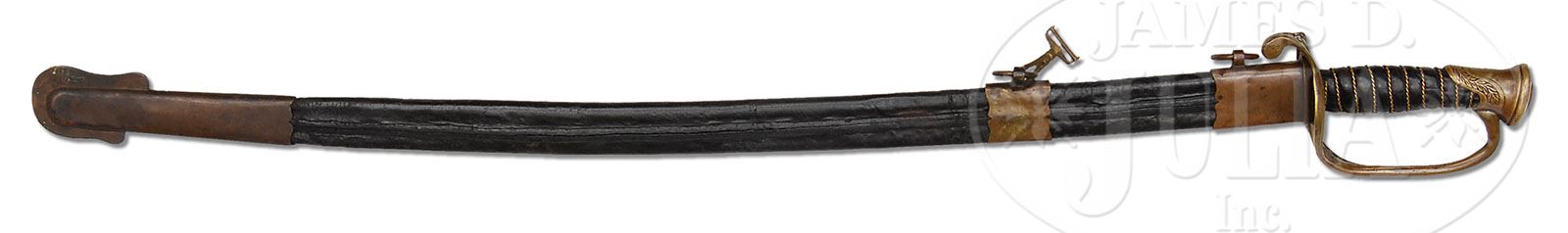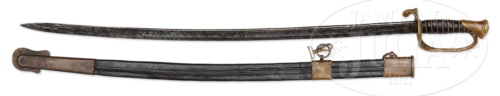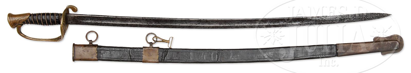 CONFEDERATE “LEECH & RIDGON” FOOT OFFICER’S SWORD INSCRIBED TO LT. ERNEST PORTIS, 42ND ALABAMA. This classic pattern foot officer’s sword with “CS” cast in guard was most likely made by Leech & Ridgon in Columbus, Mississippi while Lt. Portis was stationed in Columbus between June and September of 1862. Portis no doubt had this sword when he, along with other members of the 42nd and the 2nd Texas, assaulted Ft. Robinett at the Battle of Corinth, taking 50% casualties, where Portis was wounded. Portis returned to service after his wounding and stayed in the service in various capacities. He was captured in April 1865 at Claiborne, Alabama. Portis survived the war and worked as a physician until his death in 1903. A large portfolio accompanies this sword detailing Portis’ history and further provenance on this sword. Portis lead quite an interesting life after serving in his father’s regiment. His post war history is just as interesting and intriguing with his time as a physician and his romances in the deep South. Portis was buried on his property in Vancleave, Mississippi. Very rare are Leech & Ridgon with fully etched blades such as this. Recent information has shown that Jacob Faser was working in Columbus, Mississippi in this time frame and no doubt was the finest etcher and sword detailer in the Confederacy. Most of the handful of fully etched Leech & Ridgon swords seem to be generated in this time frame in Columbus, Mississippi. This sword in our opinion is the finest example of a Leech & Ridgon foot officer’s sword known, especially with such provenance and condition. PROVENANCE: Lt. E.A. Portis, John Hammer, James C. Harris. CONDITION: Fine overall, 29″ blade is gray/white overall, retaining much of its orig luster with scattered areas of staining. 16″ etched floral patterns contain a 5″ panel “LIEUt. ERNEST PORTIS 42 ALA. REGT”. Brass hilt, scabbard mounts retain a smooth well patina surface. Leather grip is complete with most of its orig luster. Twisted brass wire wrap is also complete and tight. Scabbard body is sound and solid though ring mounts are all loose from apparent shrinkage of orig leather scabbard. Scabbard mounts have a classic pedestal ring mount and scalloped edges unique to this manufacturer. 8-76342 JS236 (37,500-47,500)