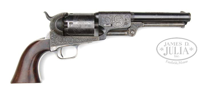 FINE ENGRAVED COLT 3RD MODEL DRAGOON PERCUSSION REVOLVER. SN 12389. Cal. 44. Beautiful modern engraved Colt Dragoon with 7-1/2″ oct to rnd bbl, German silver front sight and 1-line New York City address. Left side of frame is engraved in small letters “COLT’S PATENT”. The silver plated trigger guard & backstrap contain a burl walnut 1-pc grip constructed of two slabs of burl walnut glued to a spacer block, making the 1-pc grip. Cyl is usual 6-shots with Dragoon/Indian fight scene roll marking and all six safety pins crisp & serviceable. Frame is beautifully engraved in old donut style with full coverage foliate arabesque patterns with fine shaded background on the frame and bbl lug with another, unusual, pattern on top center of the bbl. There are fine scalloped borders at the base of the rnd part of the bbl and at the muzzle. Rammer pivot, backstrap, buttstrap & trigger guard are engraved to match. This is an exceptional recreation in orig style by a very talented engraver. SN was observed in the usual places, on bottom of bbl lug, frame, trigger guard, buttstrap & cylinder. Last four digits of SN are on the rammer handle, cyl spindle & in backstrap channel of the grip. CONDITION: Very fine. Overall retains about all of its custom finish with bright blue on the bbl & bbl lug with some fine flaking on right side; rammer & rammer handle retain strong case colors; frame & hammer also retain strong, subtle case colors; cyl retains about 95% blue and about 97-98% stagecoach holdup scene; the “MODEL U.S.M.R. / COLT’S PATENT” legends are thin but mostly visible; the Ormsby signature is also visible; trigger guard & backstrap retain most of their strong silver plating, slightly thinned on center of backstrap and at the heel; grip is sound showing light wear with a few light nicks & scratches and retains most of its strong varnish. Mechanics are crisp, bright shiny bore. 4-44905 JR483 (5,000-8,000)