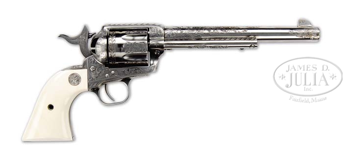 *FINE JOHN ADAMS ENGRAVED 3RD GENERATION COLT SINGLE ACTION ARMY REVOLVER. SN SA91942. Cal. 45 Colt. Nickel finish with 7-1/2″ bbl, full front sight, 1-line block letter address and model & caliber on left side. Left side of frame has 2-line 3-patent dates and rampant Colt. Mounted with smooth, silver medallion ivory 2-pc grips numbered to this revolver. Serial number was observed in usual place on bottom of frame and on left side of the front & back straps. Serial number is stamped around the cylinder bushing hole on front. Back is stamped with caliber between two chambers. Revolver is very beautifully engraved by John Adams, Colt Master Engraver, with about “D” coverage in Cuno Helfricht style with foliate arabesque patterns on sides and front of frame and sunbursts on recoil shield and loading gate. Top strap & top gullet of ejector rod housing are engraved with feather patterns. Hammer is engraved with a cow skull on each side and full coverage punch dot background. There is a unique triangle-shaped dot & diamond pattern on top of bbl at the frame with foliate arabesque patterns extending down both sides, terminating at the end of the address with matching patterns around muzzle. Backstrap & buttstrap are full coverage engraved with a beautiful fan at top of backstrap. Trigger guard is engraved to match with a small bouquet of flowers on bottom front of frame. Accompanied by its orig burgundy & gold, Styrofoam lined box that shows ivory grips on label and contains warranty card and pamphlets. Consignor states that he had John Adams engrave these revolvers several years ago. CONDITION: Extremely fine. Unfired since engraving retaining virtually all of its fine custom nickel finish. Grips are extremely fine. Mechanics are crisp, bright shiny bore. Box is fine. 4-39008 JR193 (2,500-4,000)