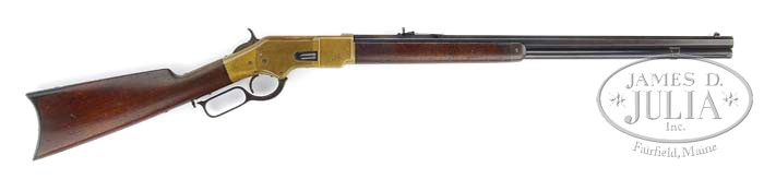 LATE WINCHESTER 1866 LEVER ACTION RIFLE. SN 152745. Cal. 44 RF. 24-1/4″ oct bbl, full magazine, 1/2 nickle front sight with checkered side “V” notch sporting rear. Usual 66 receiver mounted with straight grain walnut, uncheckered forend with steel nose cap, uncheckered straight grip stock with crescent steel butt with trap door. Inspection of lower tang reveals two sets of numbers, “174” and “233”. The “174” number can be found stamped in top tang channel of stock and inside toe of buttplate. CONDITION: Fine. Bbl and mag tube retain 70-75% orig blue with some muzzle wear, sharp edge wear. Thinning both in front and behind rear sight mixed with brown patina. There are the usual light nicks and scratches. Receiver is a fine mustard patina with nice edges, some minor scratches and shallow dents. Each side of the front receiver ring is stamped in tiny letters “W C LITTLE”. Hammer is a blending of silver and brown patina. Lever is a dark patina with some minor shallow dark oxidation across bottom. Stock is sound with some bumps and bruises, minor scratching and retains a nice hand worn patina. Forend is sound with hairline crack at forward left side, some bruises with nicks and dings and a small sliver missing from center of bottom and carries a hand worn patina finish. Mechanics are crisp with an incredible bore for a blackpowder gun, its shiny with good rifling and only some very minor, very shallow scattered pitting. 4-37469 BDT48 (12,500-22,500)