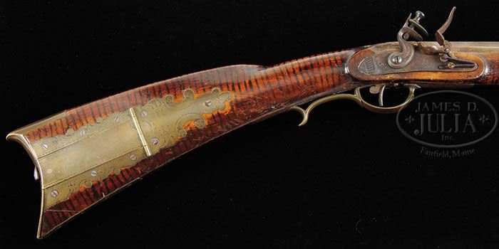 LOVELY SIGNED LEBANON COUNTY JACOB PHILIPY SMOOTH RIFLE. This rifle has a 42″ oct to rnd .54 cal smooth bore bbl that is signed in script J. Philipy. Jacob Philipy (Philipee) is listed as having worked in Lebanon County in the early 1800s. The bbl is fixed to the stock with four bbl wedges and the Maple stock has an wonderfully hand-grained red violin finish. The engraved 4-pc brass patch box is of the Bonewitz style and the rifle has the classic Roman nose stock profile. A similar rifle is seen in Capt Dillin’s book. CONDITION: This rifle is in nice attic found condition throughout having only one small 2-3/8″ x 3/16″ period wood repair on the lock side of the trigger guard finial. Much of the orig finish remains. The late English flint lock is a well executed and proper reconversion. The patch box release spring is loose and should be properly reset. 4-45155 RGG2 (6,000-8,000)