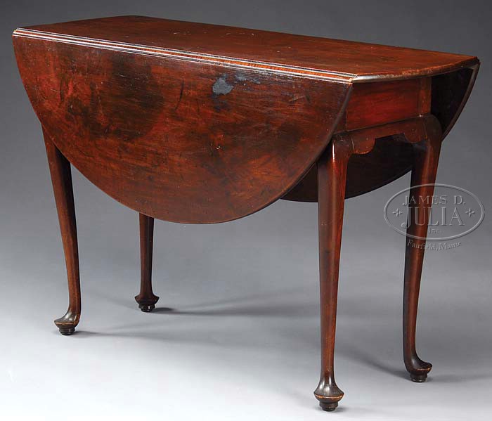 NEW ENGLAND QUEEN ANNE MAPLE DROP LEAF TABLE. Last quarter 18th century. The rectangular top with rounded ends and hinged demiline leaves projecting above the rectangular apron raised on tapering cabriole legs with shaped returns, two hinged for leaf support, terminating in platform pad feet. SIZE: 27-3/4″ h x 43″ l x 15-1/2″ w, 42″ w opened. CONDITION: Table retains dark early finish. The top with old staining and small shrinkage crack. No restorations to legs or feet noted. Good overall. 9-98171 (1,200-1,800)