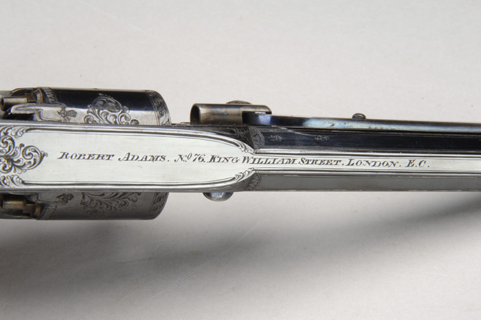 SPECTACULAR CASED ENGRAVED ADAMS PATENT DA PERCUSSION REVOLVER. Cal. 36. SN 171. Spectacular little revolver with 4-1/2” oct bbl, tiny dovetail front sight with fixed rear sight and a checkered, 1-pc walnut grip with trap in the butt. It is very beautifully engraved with about 40-50% coverage, extremely well-executed, foliate arabesque patterns on frame & cyl with matching engraving on front & backstraps and triggerguard. All eight flats of the bbl & top strap have a fine engraved line border with chain pattern at the muzzle. The butt cap & trap are beautifully engraved to match. Right side of frame has a sliding thumb safety and is engraved “ADAMS PATENT 41355” in a ribbon. The same number is also engraved on the cyl. Top strap & top flat of the bbl are engraved “ROBERT ADAMS. NO. 76 KING WILLIAM STREET. LONDON. E.C.” Accompanied by its orig, green felt lined, walnut casing, possibly for a revolver with a longer bbl, compartmented in bottom for revolver, an orig brass 2-cavity bullet mold with sprue cutter, a small Dixon bag-shaped flask, a pewter oil bottle, a brass & ebony cleaning jag/rammer, a fine English turn screw, a lacquered tin for Tranter’s Bullet Lube containing several lead bullets and a lacquered tin of Eley Bros. caps. It has a “W. Watson” distributor’s label in the lid. A fine revolver in hard to find condition. CONDITION: Extremely fine plus, probably unfired. Retains virtually all of its glossy, orig factory finish to metal, slightly thinned on triggerguard. Grip retains virtually all of its orig varnish. Mechanics are crisp, bright shiny bore. The case has normal storage scuffs & scratches on the outside with moderately faded lining with some light wear from the revolver & implements. 4-30636 JR334 (6,000-9,000)