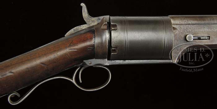 PATERSON 1839 REVOLVING SHOTGUN. SN 107. Cal. 16 ga. (approx). 35″ rnd Damascus bbl, dovetail front sight missing, standing dovetail “V” notch rear sight. Right side of bbl lug is marked with snake and star brackets “Patent Arms M’g. Co. Paterson, N.J. – Colt’s Pt.”, large 6-shot unfluted cylinder, no visible scene, “U” shaped capping notch in right side of hammer in recoil shield, scroll trigger guard. Mounted with fiddle back walnut, uncheckered straight grip, crescent steel buttplate with rounded heel. Only inspection for serial number was bottom wedge, which is “107”. CONDITION: Very good plus. Bbl shows dark brown Damascus pattern with some areas thinning and blending with silver patina, some minor surface corrosion at muzzle and breech end. Bbl lug is a brown and silver patina with some minor surface pitting near cylinder. Cylinder and recoil shield are a dark brown patina with some fine surface corrosion at front and rear of cylinder. Stock is sound with nicks, dings & small dents, and retains an old thin coat of added finish blending with hand worn patina in grip area. Hammer cocks and rotates cylinder and is safe in both notches, cylinder does not lock in place. Bore appears good with just some minor corrosion. 4-41240 BDT292 (13,500-17,500)