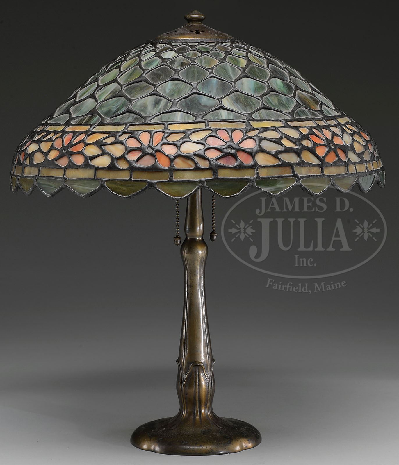 LEADED GLASS TABLE LAMP. Table lamp has leaded glass shade with bottom border of orange flowers with amber glass leaves. The flower band is bordered at top and bottom by yellow/amber geometric panels and a green irregular border below. All set against a honeycomb background of rich green striated glass. Shade rests on a Handel base with raised stylized leaf design at bottom of the stem, two-socket cluster with acorn pulls and heat cap with fleur-de-lis vents. Base has a gold finish and is signed on the side of the foot “Handel”. SIZE: Shade is 17″ dia. Lamp is 20″ t. CONDITION: Very good with some pitting and blistering to base. 5-67532 (2,000-3,000)