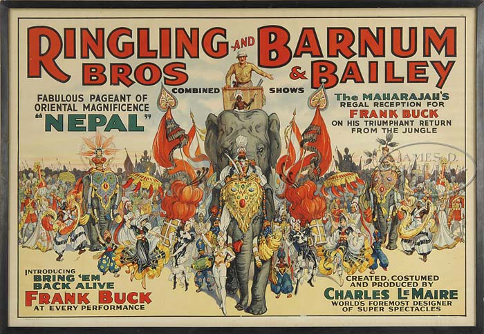 RINGLING BROS. AND BARNUM & BAILEY “FRANK BUCK” CIRCUS POSTER. Circa 1938 Frank Buck “Nepal” poster that’s billed as “The Maharajah’s Regal Reception for Frank Buck on his Triumphant Return from the Jungle”. Seen among the colorful menagerie of Indian and Nepalese characters are exotic dancers, drummers, uniformed military officers and the Maharajah himself atop the lead elephant. SIZE: One sheet poster, 40-1/2″ w x 27-1/2″ h. CONDITION: Very good to excellent. 1-11069 (500-1,000) Auction: Advertising, Toy & Doll - Spring 2011 Please Note: All prices include the hammer price plus the buyer’s premium, which is paid by the buyer as part of the purchase price. The prices noted here after the auction are considered unofficial and do not become official until after the 46th day. |