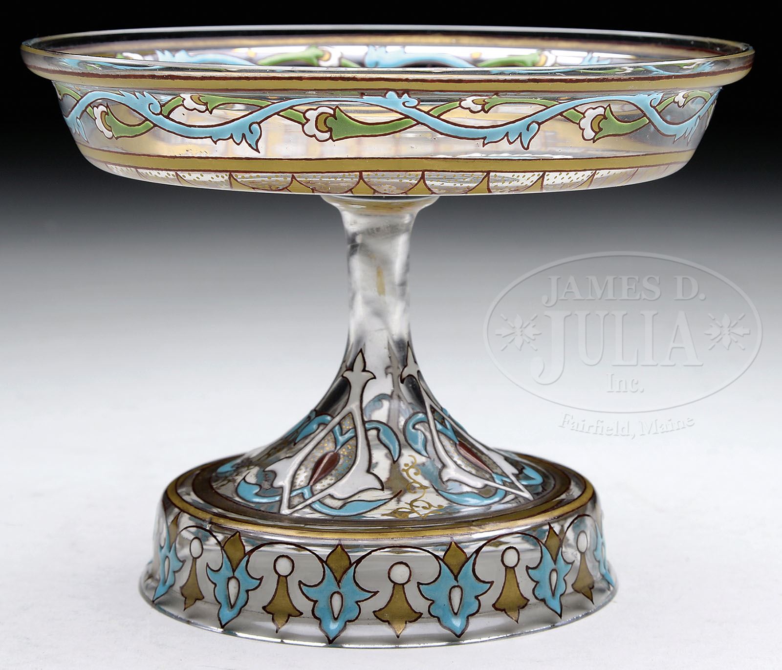 ENAMELED GLASS COMPOTE. Enameled glass compote by Imberton has center medallion with ancient boxers and judge done in gold against a heavily enameled blue background with gold titles “ILARUS, ASELIUS, CONSTANTIUS”. The edge of the compote is decorated with heavily enameled blue and green stylized floral garlands. The stem and base of the compote are also heavily enameled in blue, red and white with stylized decoration. For a similar example see The Art of French Glass by Janine Bloch Dermant 1860-1914, pg 23, photo #13. SIZE: 6″ dia x 4-1/2″ t. CONDITION: Very good to excellent. 5-67679 (800-1,200)