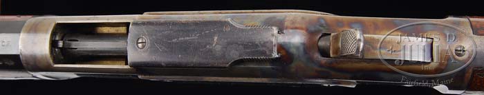 EXCEPTIONAL WINCHESTER 1873 DELUXE WITH BRITISH PROOF MARKS. SN 302668. Cal. 44 WCF. 24-1/4″ oct bbl, full mag, fine bead front sight, serrated side “V” notch sporting rear. Top flat of bbl is marked “WINCHESTER’S REPEATING ARMS.NEW HAVEN.CONN.U.S.A./KING’S IMPROVEMENT PATENTED MARCH 29.1866 OCTOBER 16.1860”. Top flat adjacent receiver is caliber marked “44 W.C.F.” and left flat with a series of four proof marks, with a single Crown “V” proof mark adjacent left side receiver. Standard 3rd Model 73 receiver mounted with “XXX” quality walnut, deluxe checkered forend with nose cap, checkered pistol grip stock with V-shaped ebony insert, steel crescent buttplate with trap door. Inspection of inside lower tang reveals Assembly No. “2504 XXX” the matching 2504 number can be found in top tang channel of stock and inside toe buttplate. Accompanied with Cody Firearm Museum fact sheet identifying as 44 cal rifle, oct bbl, plain trigger, checkered pistol grip stock, Winchester express sights and case hardened; received in warehouse August 26, 1891 and shipped from warehouse September 12, 1891 on Order No. 1965. CONDITION: Extremely fine. Bbl retains 95% orig blue with minor sharp edgewear, some minor nicks & dings, and a couple small spots of faint surface oxidation. Mag tube retains 90% orig finish that is starting to tone to brown patina with minor nicks & scrapes. Receiver retains 95-98% strong brilliant orig case colors, thinning on front edges and across bottom, but is very strong and bright on both sides and across top. Dust cover retains much of its orig blue with some minor nicks & dings. Loading gate retains most of its bright nitre blue with a minor silver rub line. Hammer retains strong bright orig case colors with some minor thinning and silvering on left side. Lever retains strong bright orig case colors with some minor thinning on rear of bottom. Stock is sound with very good checkering, a few minor shallow dents and typical nicks & dings, retaining much of its orig deluxe piano factory finish. Buttplate retains strong bright orig case colors, starting to thin in upper half of curve. Forend is sound with very good checkering, some minor shallow dents, typical nicks & dings, retaining much of its orig piano factory finish blending with hand worn patina across bottom. Nose cap retains most of its bright orig factory case colors. Mechanics are crisp with a bright shiny bore. 4-38087 BDT236 (35,000-40,000)