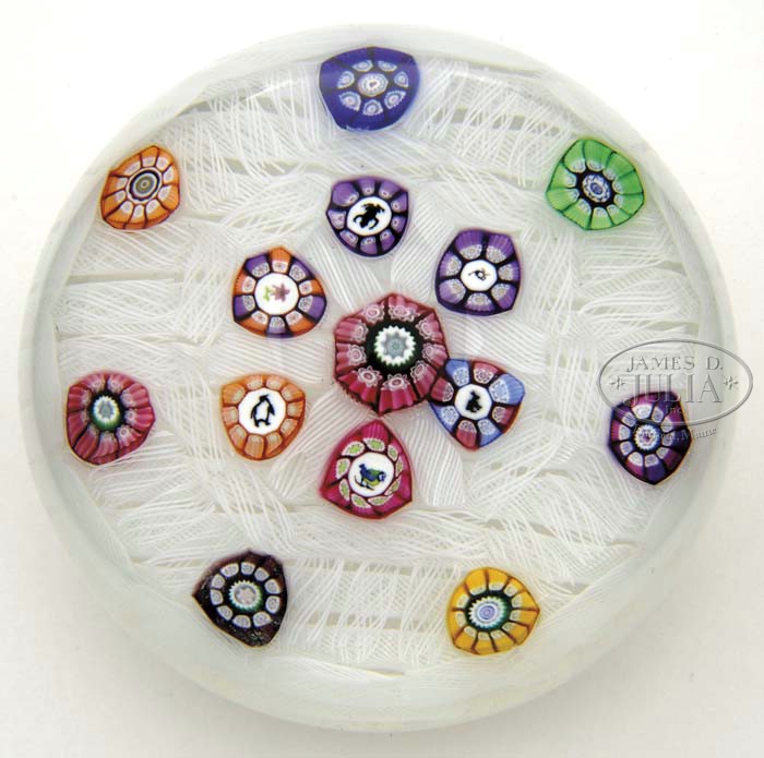 PERTHSHIRE PAPERWEIGHT. Perthshire paperweight with six silhouette canes including a frog, an ostrich, a rabbit, a bird, a penguin and a flower. Signed with a signature date cane on the reverse “P1991”. SIZE: 2-1/4″ t x 3″ dia. PROVENANCE: From the Estate of Bernard Piken; Boston, Mass. CONDITION: Very good to excellent. 5-62381 (100-200)