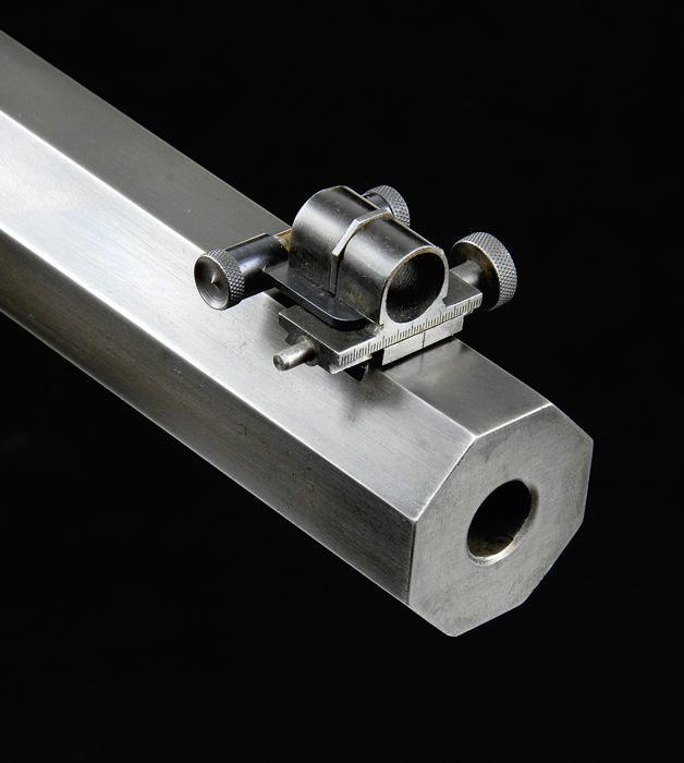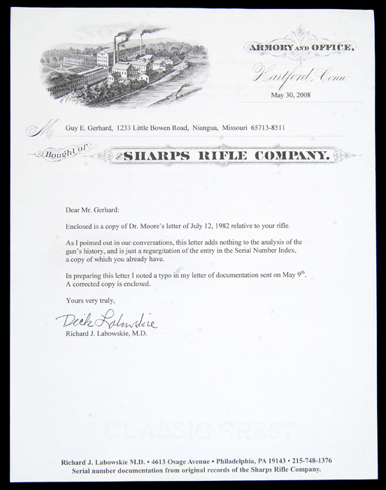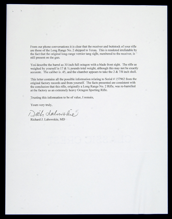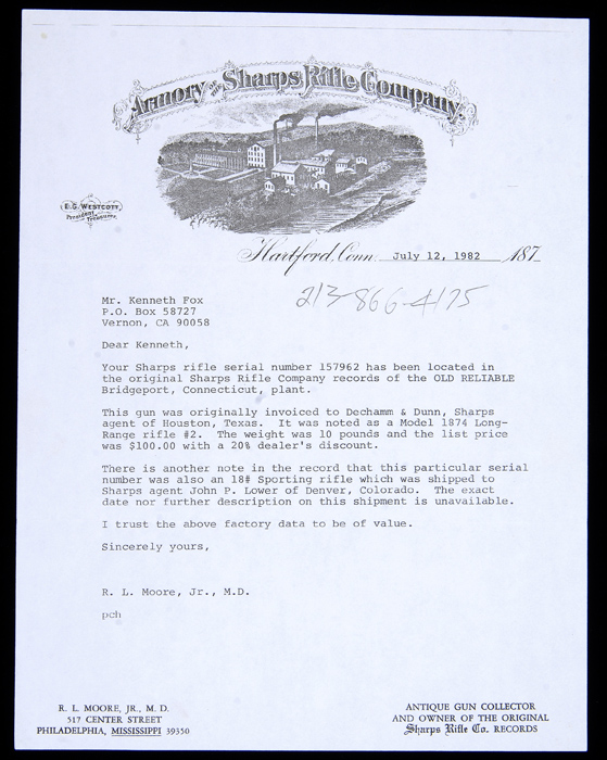 VERY RARE SHARPS 18 POUND LONG RANGE ULTRA-HEAVY SPORTING RIFLE WITH J.P. LOWER HISTORY. SN 157962. Cal. 45 2-7/8 (45-110). Fine buffalo rifle with 30″ full oct bbl, extra heavy, the same width as the receiver with windgage spirit level globe front sight, no provision for a rear sight and long range tang sight with 5″ staff numbered to this rifle. Top flat of bbl is marked with the “OLD RELIABLE” and Bridgeport address along with “J.P. LOWER / DENVER COL.”. The caliber is marked over the chamber area and the case length is on the right side flat. Receiver has the usual company name & patent number on left side with no additional markings on receiver or lockplate. Rifle is mounted with nicely figured slab-sawed American walnut with uncheckered schnable tip forearm secured with two screws and a checkered pistol grip buttstock with checkered steel buttplate. It has standard Sharps lever & checkered trigger. Accompanied by a Sharps records letter identifying this rifle as listed in Order Book #5 as a Long Range No. 2 invoiced at the Bridgeport Factory April 5, 1877 “As consigned to Deachamm & Dunn of Houston, Texas”. It is described only as 45 caliber with a weight of 10 lbs. The letter continues that it was returned to the factory on Jan. 10, 1878 along with three other Sharps rifles. The SN index for the Model 1874 Sharps contains the written notation “Deachamm & Dunn to Lower 18 lbs. Sptg.”. Dr. Labowskie, the owner of the Sharps records and originator of this letter states “This I take to mean that this target rifle was re-configured as an ultra-heavy sporting rifle and shipped to John P. Lower, gun and sporting goods dealer of Denver, Colorado.”. He explains that this index was created many years ago by Frank Sellers and his associates as a means for rapidly accessing the shipping histories of individual Sharps rifles. It was compiled from the Order Books and from Shipping memoranda, transfer copies of outgoing company correspondence, and, in some cases, from customers’ letters. He states that not all of this material has survived in his possession. He additionally states that he can find no reference to this rifle as an 18 pounder or that it was invoiced to Lower, however in 1879 Lower did clear out the remaining heavy sporting rifles in the Sharps inventory. Also accompanying is another letter dated 1982 over the signature of Dr. R.L. Moore, Jr., the then custodian of the Sharps records who also notes that it was an 18 pound sporting rifle shipped to Lower in Denver. Additionally accompanying is a copy of the number index or possibly Order Book which initially identifies it as a No. 2 Long Range with the notation “Deachamm & Dunn to Lower 18 lbs. Sptg.”. This rifle was ultimately shipped to one of the major buffalo hunter suppliers and Sharps Agent for the Rocky Mountain Region of Colorado, Western Kansas & Southern Wyoming during the great buffalo hunts and undoubtedly saw service out on the prairie shooting buffalo. CONDITION: About fine. Bbl retains about 95% smooth strong orig blue turning a little plum with sharp edge wear and slight thinning on top flat. Receiver, lockplate, hammer, lever & bottom tang are mostly a mottled silver/brown patina with the silver areas faded case colors. Wood is sound with the forearm having a few nicks & dings across the bottom and retains most of its orig varnish. Stock shows heavy wear on the checkering with normal nicks, dings & scratches and retains about 90% orig varnish. Mechanics are fine, brilliant shiny bore. 4-42686 (12,000-17,000)