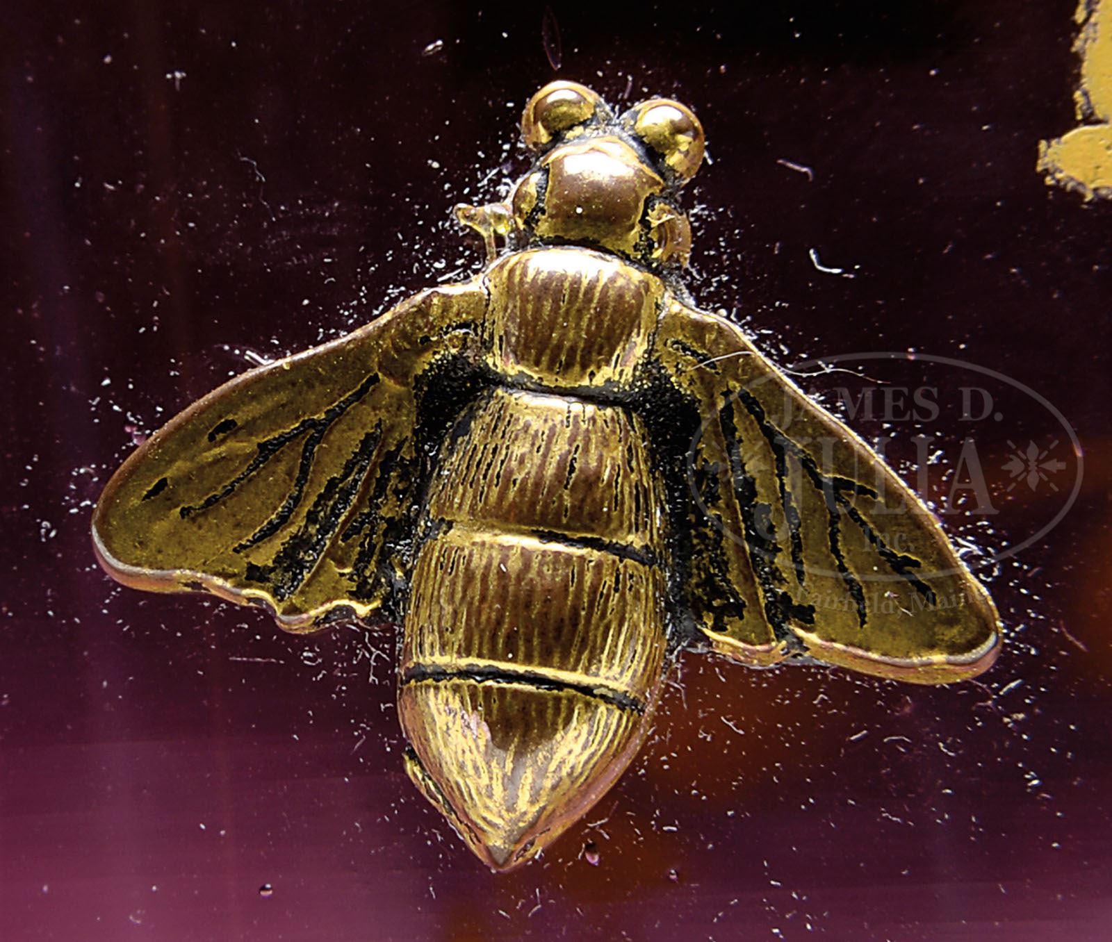 AMETHYST DECORATED VASE. Amethyst decorated vase attributed to Mont Joye has heavily enameled flowers with gilded floral background against a rich amethyst glass body. The vase is further decorated with large applied gilded bumblebees. Unsigned. SIZE: 11″ t. CONDITION: Very good to excellent. 5-67821 (800-1,000)