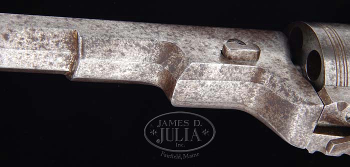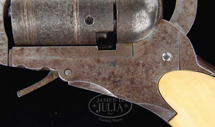 VERY EARLY PRESUMED COPY OF A COLT NO. 5 HOLSTER MODEL TEXAS PATERSON PERCUSSION REVOLVER. SN 112. Cal. 36. Wonderful early Paterson copy, one of the finest we have offered, with 9″ oct bbl, large letter bbl address “Patent Arms M’g. Co. Paterson, N.J.-Colt’s, Pt.” with an asterisk & snake at each end. It has a 5-shot square-shoulder cylinder with stagecoach hold-up scene. Mounted with 1-pc ivory grip made in the Colt fashion with two plates of ivory glued to a walnut block. Serial number was observed on rear face of bbl lug, on wedge, on cylinder pin, rear face of cylinder & on butt strap. No further disassembly was affected to check for other matching numbers. Frame appears to have been made in two pieces and forged together with front grip strap attached. A partial “s” is visible on rear cylinder face & buttstrap Bore has eleven lands & grooves in nearly straight rifling with only a slight left hand twist. Front grip strap has been repaired at joint with frame. CONDITION: Fine. Overall retains a smooth mottled silver/brown cleaned patina. There is light surface etching over most of metal but no deep pitting. Cylinder has identical condition with some fine pitting and retains about 60-70% stagecoach holdup scene. Grip is sound with an age line on left side and retains a wonderful mellow ivory patina. Broken front sight. Mechanics are fine, strong sharp bore with fine pitting. 4-35578 (15,000-35,000)