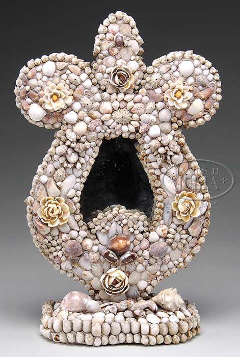 UNUSUAL SHELL-FORM SAILOR’S FOLK ART DRESSING MIRROR. Early 20th century. The lyre-form frame on a shaped plinth profusely and artfully decorated with shellwork in the form of flowerheads and rosettes. SIZE: 19-3/4″ h x 12-1/2″ w x 6-3/4″ d. CONDITION: Very good overall with minimal and minor loss to shell border. 9-98155 (500-800)