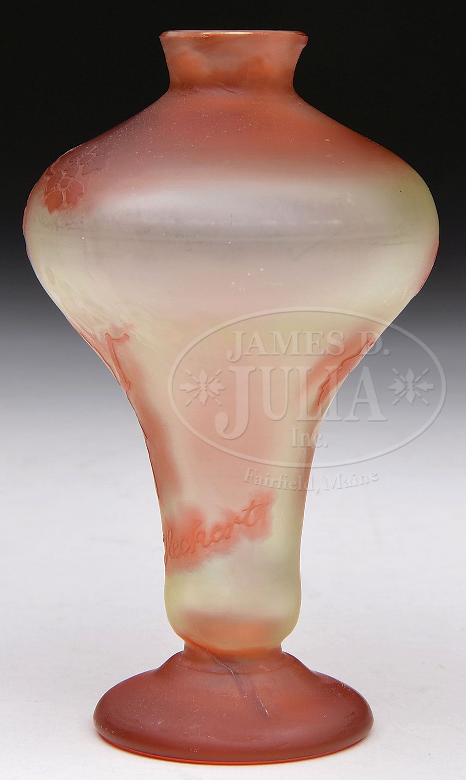 HECKERT CAMEO VASE. Heckert vase is decorated with salmon colored cameo flowers, stems and leaves against a frosted background. Signed on the side in cameo “Heckert”. SIZE: 5-3/4″ t. CONDITION: Very good to excellent with some minor roughness to outside lip from the making. 5-65351 (300-500)