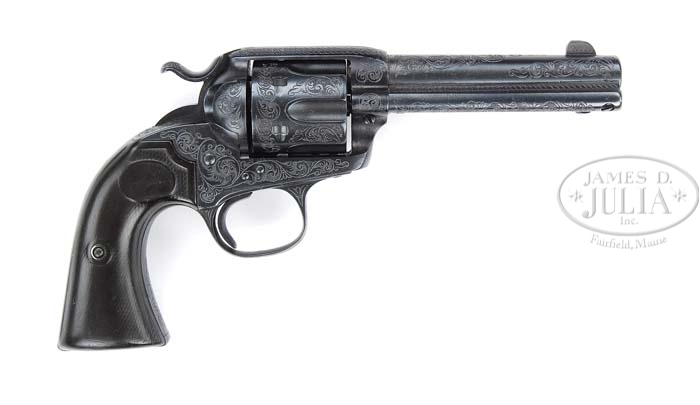 *RARE NICK KUSMIT ENGRAVED COLT BISLEY FRONTIER SIX SHOOTER SINGLE ACTION REVOLVER. SN 279906. Cal. 44-40. All blue finish with 4 3/4″ bbl, slightly altered front sight, 2-line address “COLT FRONTIER SIX SHOOTER” on the left side. Left side of frame has 2-line, 3 patent dates and rampant colt in a circle. It is mounted with rampant colt hard rubber grips. Frame, cylinder and barrel are nicely engraved with about 50% coverage foliate arabesque patterns with punch-dot background. Screwheads on the left side of the frame are engraved. Consignor states that through is friendship with Nick Kusmit, the famous and well-known Winchester engraver, he was able to convince him to engrave several handguns and a few rifles for him. PROVENANCE: Ted Knee Collection. CONDITION: Fine. Overall retains about all of its custom post-engraving blue finish with left side barrel marking thinned. Hammer is not solid in safety or half-cock notches, otherwise mechanics are fine. Grips show extreme wear turning chocolate. Strong bore with light to moderate pitting. 4-36599 JR165 (4,000-6,000)
