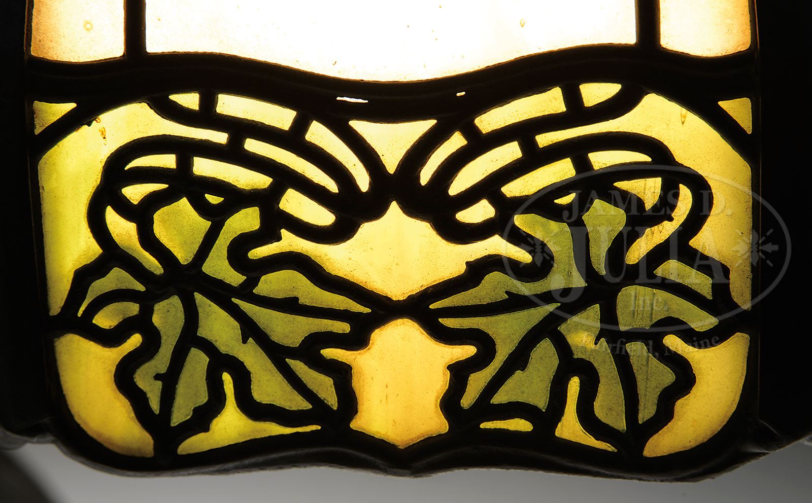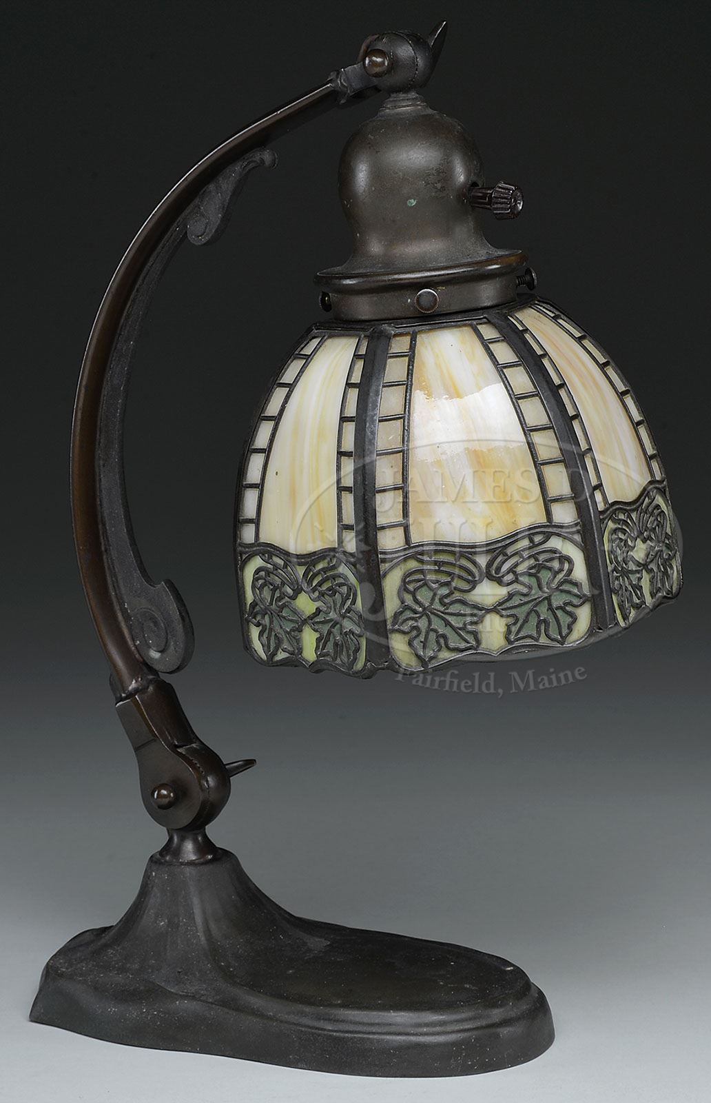 HANDEL DESK LAMP. Handel desk lamp has metal overlay shade with a bottom border of overlaid grape leaves against a striated green glass background. Each grape leaf is painted on the obverse in deep green. Shade is finished with caramel slag bent panels, each framed with a metal overlay lattice design. Shade is housed in a Handel adjustable desk lamp base with Art Nouveau platform and an adjustable curved arm supporting the socket and shade. Shade and base are unsigned. SIZE: Shade is 5-3/4″ dia. Lamp is 14″ t. CONDITION: Very good with some discoloration to finish on base. Felt covering on underside of base is missing. 5-68089 (1,000-1,500)