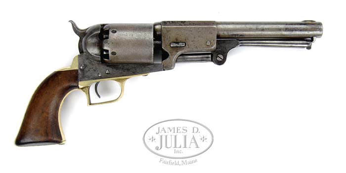 SCARCE COLT 1ST MODEL DRAGOON PERCUSSION REVOLVER. SN 7582. Cal. 44. Usual configuration with 7-1/2″ oct to rnd bbl, German silver front sight & 1-line address reading from cylinder to muzzle. It has its orig vertical latch rammer & 6-shot cylinder with oval notches & “COLT’S PATENT” over a tiny “U.S.” on left side of frame. It has square back brass trigger guard & back strap with a 1-pc walnut grip. Back strap is scratched with initials “HH” and butt strap has crude scratched initials “MWK”. Only about 7,000 of these rare revolvers were produced 1848-1850 and most saw hard service on the Western frontier and into the Civil War. CONDITION: Fair to good. No orig finish remains being an overall mottled gray/brown patina with fine pitting over most surfaces & heavy wear on left side of muzzle. Bottom of bbl lug is missing small pieces of metal over frame pin holes & wedge spring is missing. Cylinder has one area of moderate pitting with light pitting elsewhere & retains 25-30% orig Ranger/Indian fight scene. Serial number on cylinder is not visible. Hammer nose has a large deep pit with other pitting on both sides. Trigger guard & back strap are a cleaned bright yellow brass finish. Grip has a chipped right toe & shows heavy wear with a hand worn patina. Mechanics are fine, strong bore with moderate to heavy pitting. 4-35447 (13,500-15,500)