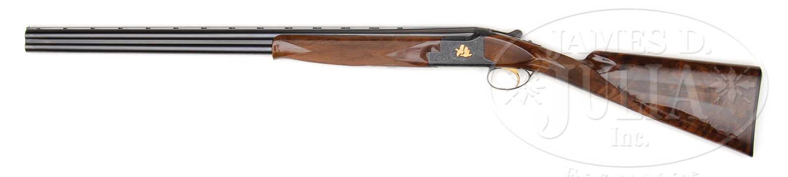 *BROWNING SUPERPOSED 20 GAUGE P 1 H SUPERLITE TWO BARREL SET BAERTEN ENGRAVED WITH CASE. SN P24RP1231. Cal. 20 ga. 2-3/4″ Chambers. 26-1/2″ Barrels are marked “1” and “2”. With standard name, address and caliber markings. Bbl set no. “1” is marked ontop bbl *, and on bottom bbl **. Bbl set no. “2”, is marked on top bbl **, and on bottom bbl **-. Blued action has light scroll and oak leaves framing relief gold inlays of quail in flight on both sides. Engravers signature “J Baerten” is at bottom rear left side action. Striking burl figured walnut straight grip buttstock measures 14-3/8″ over Browning composition buttplate, and features point pattern checkering with double line borders. Matching one piece forends have schnabeled tips. BBL set no. “1”: Bore diameter: top -.619, bottom -.618. Bore restrictions: top -.025, bottom -.011. Wall thickness: top -.033, bottom -.035. Drop at heel: 2-1/4″, drop at comb: 1-5/16″. Weight: 5 lbs. 10 oz, LOP 14-3/8″. BBL set no. “2”: Bore diameter: top -.618, bottom -.619. Bore restrictions: top -.009, bottom -.004. Wall thickness: top -.033, bottom -.036. Weight: 5 lbs. 9-1/2 oz, LOP 14-3/8″. Dark brown leatherite case is lined with dark brown faux fur, and contains catalog, market survey card, and 2 keys. CONDITION: Excellent, near new, with evidence of light use, and a few minor marks on wood and metal. Some discoloration to muzzles of bbl set no. “2”. Checkering is slightly darkened at grip. Case is excellent. 4-46361 MGM42 (9,500-12,500)