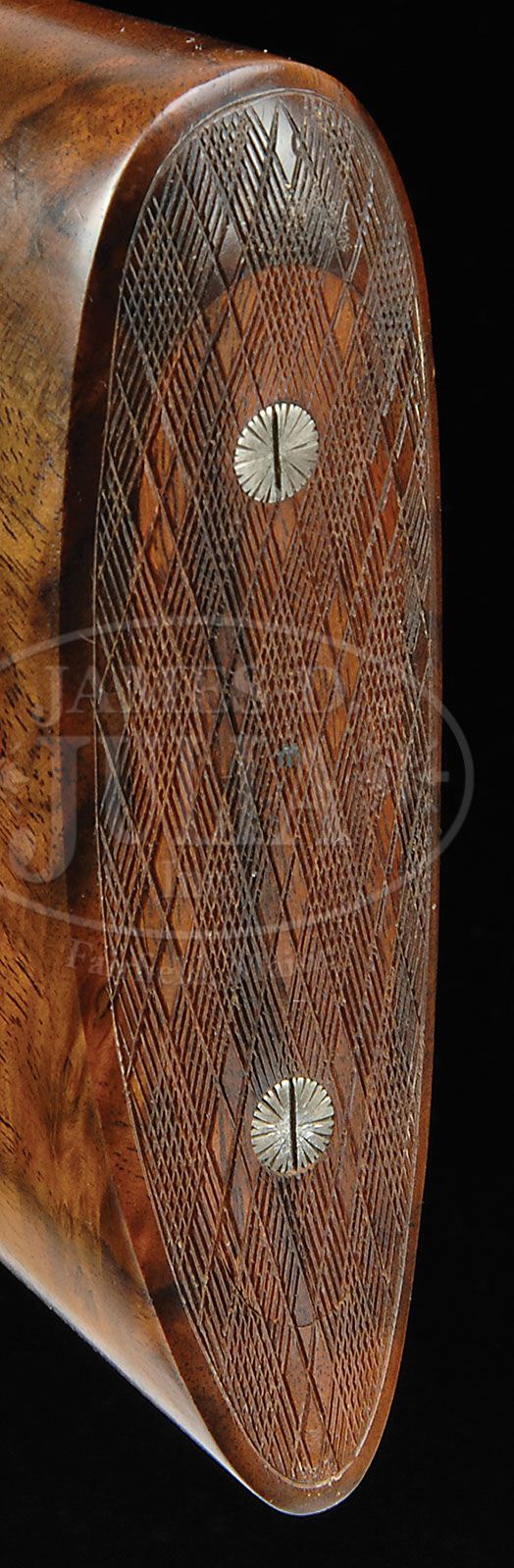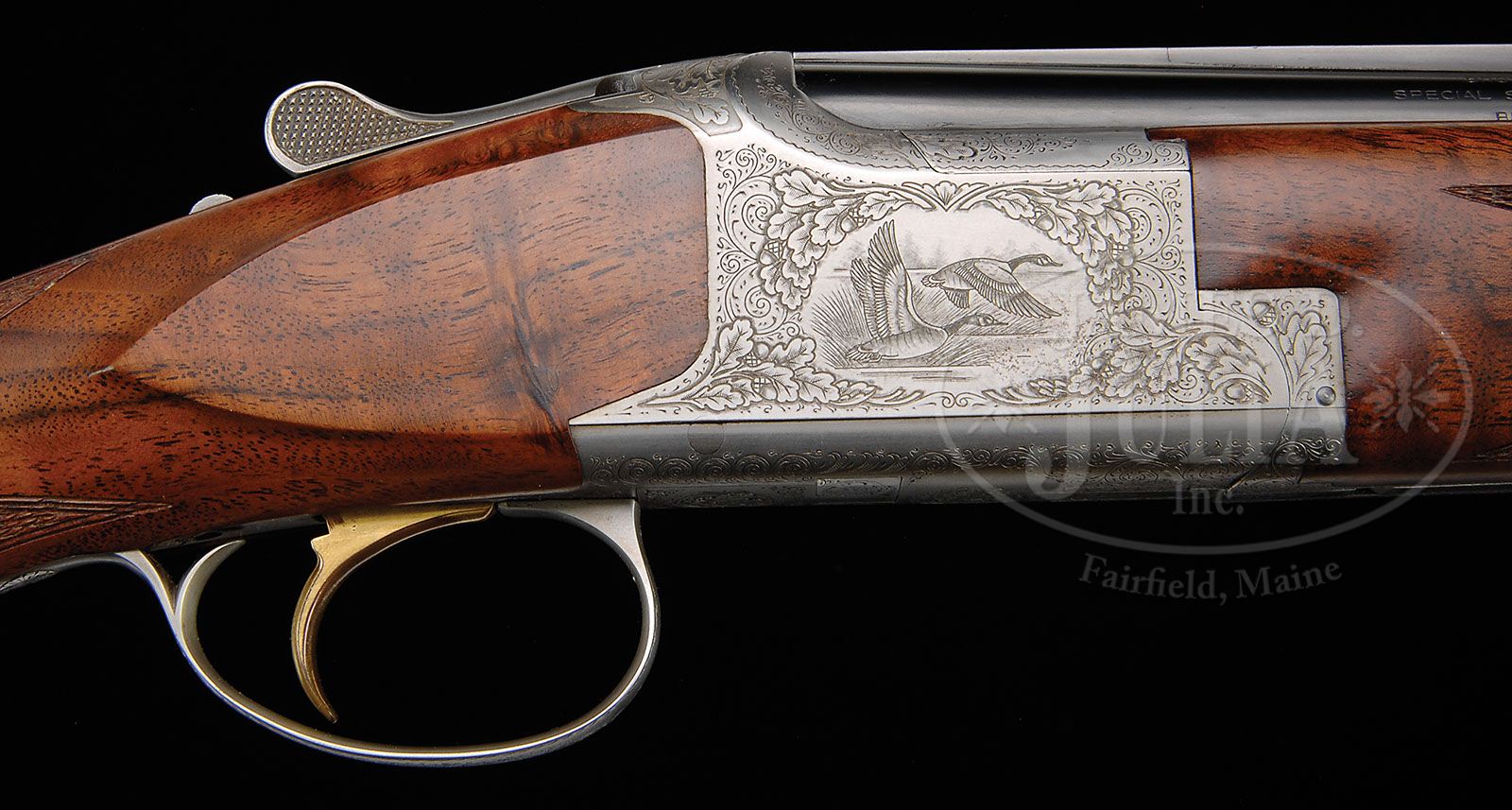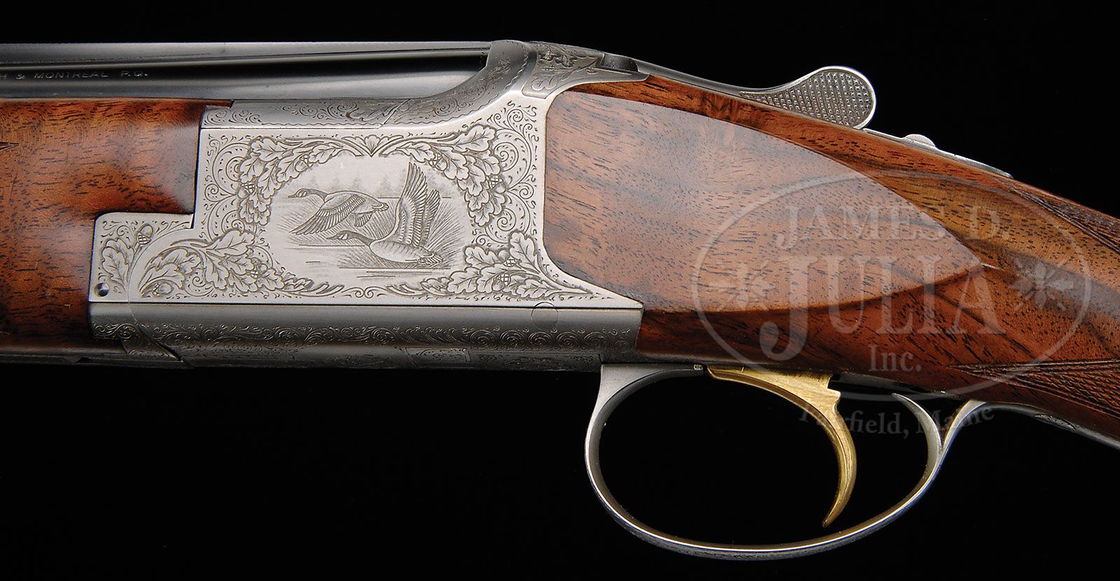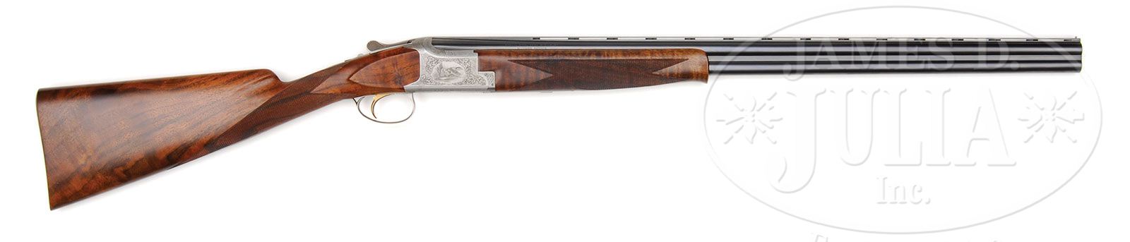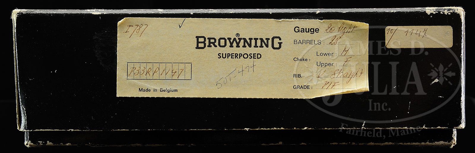 *SPECIAL ORDER BROWNING SUPERPOSED P1-F SUPERLITE WITH BOX. SN P33RP1147. Cal. 20 ga. 3″ Chambers. 28″ Bbls with narrow, ventilated rib, choked Modified and Full, have Morgan, Utah and Montreal address, along with “Browning Superposed” and gauge information on top bbl. Grey finished, rounded action has a mix of acid etched and hand engraving in “F” style with Canada geese on either side. No engravers signature is present. Nicely variegated and figured Claro walnut oil finished straight grip point pattern checkered buttstock measures 14-3/8″ over skip-line checkered butt. Matching one piece schnabeled forend has typical Browning latch. Bore diameter: top -.620, bottom -.619. Bore restrictions: top -.022, bottom -.008. Wall thickness: top -.042, bottom -.042. Drop at heel: 2-3/16″, drop at comb: 1-5/16″. Weight: 6 lbs. 3 oz, LOP 14-3/8″. Black and gold original box has label matching this gun. One-of-a-kind special order. PROVENANCE: Factory letter with specifications for this gun. Copy of invoice with all specifications. Orig shipping notice. CONDITION: Excellent, near new, showing very limited use, retaining nearly all orig metal finish. Stocks have a few minor marks. Mechanically crisp. Box is very fine, with considerable chipping on top edges. Label is slightly foxed and lifted at corners. 4-46936 MGM138 (8,500-12,500)