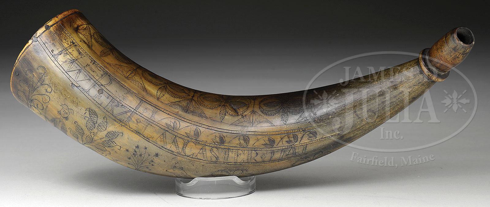 F W PERZL POWDER HORN. Circa 1747, Lancaster, Pennsylvania. Decorated with scenes of hunters and fanciful landscape. One a hunter with his dog, the second a hunter shooting an animal resembling a wolf. Alternating with bands of scrolling and geometric designs. SIZE: 15″ l. CONDITION: The horn retaining natural aged tones in shades of tan, green and gray with one small imperfection at midpoint of horn. Otherwise very good. 9-28793 (1,000-2,000)