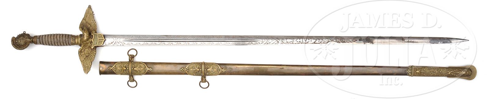 WONDERFUL CIVIL WAR PRESENTATION SWORD TO BRIG. GENERAL LAWRENCE GRAHAM. This is a beautiful sword with a massive cruciform guard in the form of a heraldic spread wing eagle. This sword measures 39″ overall with a 31-1/2″ two sided blade with etched floral and geometric patterns with a central fuller. Grip is sharkskin with a knight’s head pommel and a solid brass scabbard with raised relief mounts with human hands used as sword ring attachments. The sword was made by & marked on ricasso by Coulau of Klingenthal, France where many of the great 19th century and earlier sword blades were made. Sword is inscribed on scabbard between top mounts “To Brig. Gen’l L.P. Graham from his staff January 1, 1862”. This sword is in beautiful condition retaining original gold wash on mounts and blade retains much of its original muster. General Graham was born in Virginia in 1815 and graduated from West Point and had a long military career. Even though a Southerner, Graham fought for the Union cause after being an officer in the Seminole Wars in Florida and the Mexican War. When the Civil War began Graham was a major in the regular army but almost immediately was appointed Brigadier General of Volunteers and was in charge of a brigade by the end of 1861. In the March of 1862 General Graham was a Division Commander in the 4th Army Corps. General Graham directed his division at the siege of Yorktown but became ill and was given less strenuous duties in St. Louis and Annapolis. General Graham retired from military service in December 1870 and spent his last 35 years (living to ripe old age of 90) as a Shakespearean scholar outliving his wife and his sons, one of which was also a West Point graduate, who are also buried with him at Arlington National Cemetery. CONDITION: Sword is in very good condition overall. Inscription is easily read as can be seen in photos. Brass scabbard, mounts, cross guard, and pommel all have good yellow brass patina with traces of gilt in their background. Chain connecting guard and pommel is missing but is easily replaced if wanted. Blade retains much of its original luster especially in etched panels with pitting and staining especially near tip. There is a leather sleeve that accompanies this sword which has protected its scabbard for many years. Sleeve is in poor condition being highly scuffed, worn, and a hole at the bottom and others in body. 4-49197 JS73 (6,000-9,000)