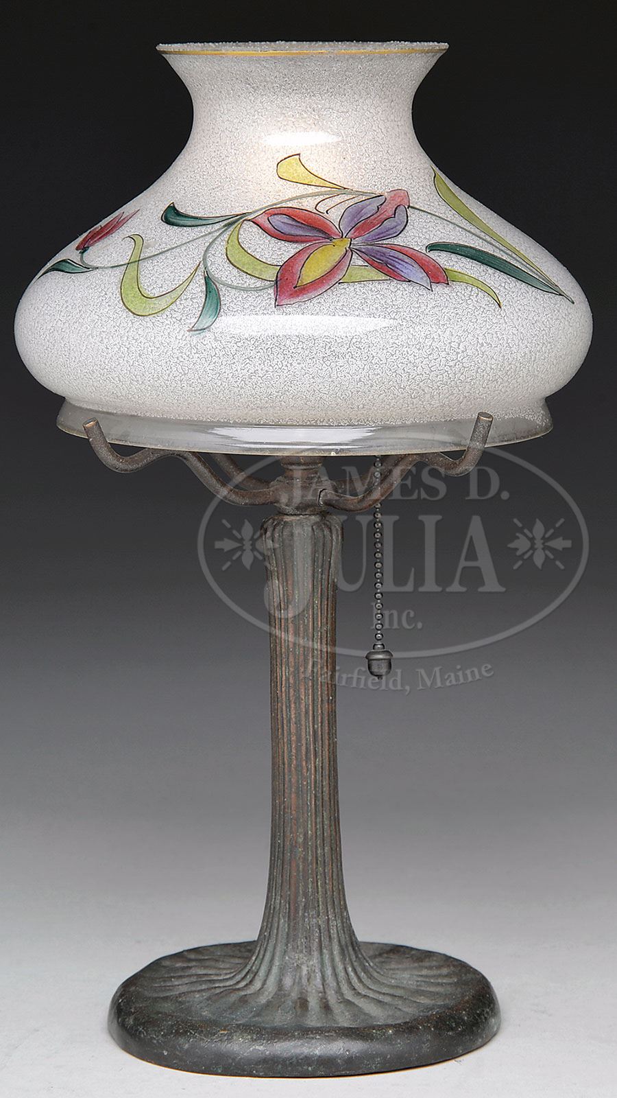 HANDEL BOUDOIR LAMP. Handel boudoir lamp has clear glass shade with obverse-painted stylized flowers, stems and leaves. The interior of the shade has been overshot to give a textured appearance to the background. The shade rests on a signed Handel base with vertically ribbed organic form. SIZE: 10-1/4″ t. CONDITION: Very good, with one shell-shaped flake on outside bottom rim of shade and some minor discoloration to patina on base. 5-66987 (400-800)
