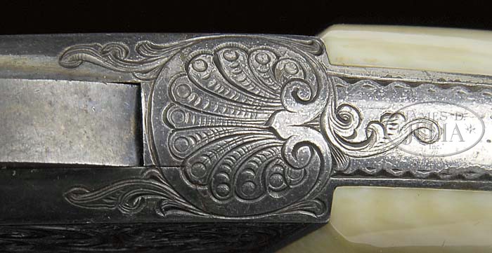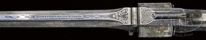 RARE CASED NIMSCHKE ENGRAVED PRESENTATION QUALITY SMITH & WESSON NO. 2 ARMY SPUR TRIGGER TIP-UP REVOLVER. SN 31045. Cal. 32 RF. Silver & gold finish with 6″ oct keyhole shaped bbl, with half moon front sight and usual Smith & Wesson Springfield address. Mounted with beautiful smooth 2-pc ivory grips. Revolver is beautifully engraved from the hand of Master Engraver L.D. Nimschke with nearly full coverage intertwined very fine foliate arabesque patterns with fine punch dot background. Engraving extends over side flats of bbl lug and onto the top flat of bbl with zig zag patterns above & below open panels on side flats that are stamped with tiny 5-point stars. Muzzle ends of the side flats are engraved with matching patterns and top of rib is engraved with geometric patterns forward & aft of the address with the bbl address surrounded by dash & dot patterns. There is a tiny shaded engraved panel just in front of the front sight at the tip of the rib and there are two incised lines around muzzle. Sides of frame, above & below cyl opening, are engraved in fine border patterns and the top of back strap is engraved with a beautiful shell pattern. Heel of back strap is engraved in foliate arabesque patterns with a chip & dash pattern along each side. Butt strap is engraved with Nimschke’s trademark intertwined ribbon patterns as found on Nimschke engraved Henry & 1866 Winchester rifles with matching mirror image fan patterns. Cylinder is engraved to match with continuous foliate arabesque scrolls and a dash & dot border around each edge. The assembly number “L2” was noted on left heel of grip frame, under the grip, on rear face of bbl lug and front face of cylinder. The number “186” is stamped on left side of front strap under the grip and a small “D” is stamped on bottom flat of bbl, just below muzzle. Accompanied by an outstanding, orig rosewood presentation case with empty brass medallion in the lid. Interior is lined with burgundy velvet and is compartmented in bottom for revolver, an empty box of UMC cartridges, another compartment with five live rnds and a pewter oil bottle with a functioning key. Bottom rear of compartment also has two early cleaning implements. This is a most exceptional & rare presentation quality Smith & Wesson. CONDITION: Extremely fine plus, all matching except grips which are unnumbered. Overall retains virtually all of its strong orig silver plating with scattered gold wash on cyl & ejector pin. Rear face of cyl retains most of its orig gold wash. Hammer retains strong case colors on sides with some light wear and faded case colors on edges. Grips are sound showing no visible wear and retain a fine ivory patina. Mechanics are crisp, brilliant shiny bore. Case is sound with some minor grain checks in lid and retains most of its orig green paper covering on bottom. Interior is moderately faded & lightly soiled with a couple of loose partitions. Cartridge box label is lightly faded and the lid has two broken corners. Other implements & accessories are fine. 4-36677 JR49 (30,000-40,000)