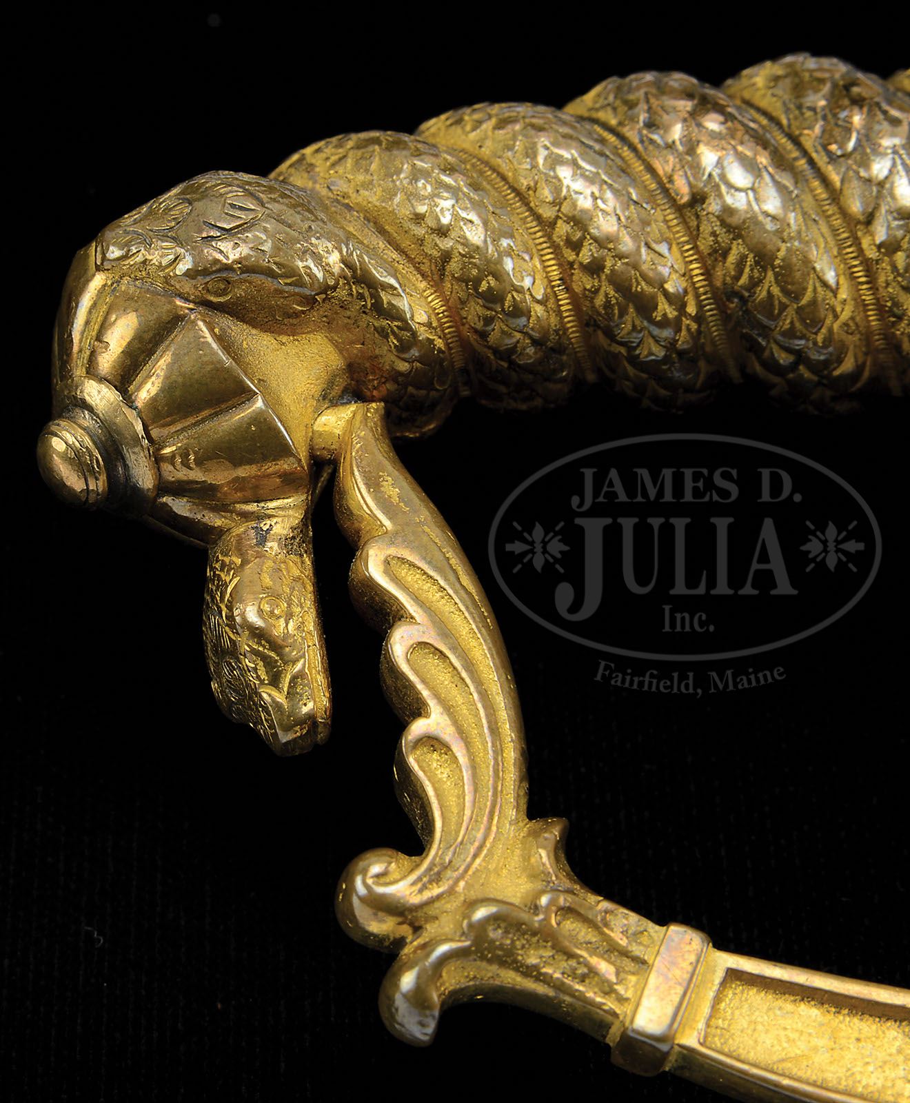 RARE MODEL 1840 U.S. ENGINEER’S SWORD. This very rare Ames regulation engineer’s sword rarely comes to market. This example is from the famous Philip Medicus collection and is pictured in Norm Flayderman’s book on swords from that collection. This is the only regulation American sword with Colichemarde blade. All 3 edges of blade have etched panels, including large panel which reads “U.S. Corps of Engineers”. Flayderman described this sword in his text on pg 142; “A U.S. M1840 Engineer Officer’s Sword having a gilded-brass hilt and a straight, three edged eppe, , tapering blade which measures 31-1/2-inches. It has a white raised finish with scroll and floral engraving. Two snakes, wounded around a staff, are on the lower obverse base. ‘NP Ames/Cutler/Springfield’ is marked at the reverse base; ‘US Corps of Engineers’ is found parallel to the blade, 9-inches from the reverse base. There are twenty-six stars on the counter guard, and one large star at the right of the counter guard. Again, one large star is found on the center of the knuckle guard. The sword has a plain, folding rear guard and brass grips that have been formed to simulate a coiled rattlesnake with its tail at the base. The scabbard is brass with a wide, brass throat and a brass tip with drag and frog stud having an American shield. Very rare sword; limited production.” PROVENANCE: Philip Madicus and Norm Flayderman. CONDITION: Sword is in fine condition overall. Hilt is slightly bent at knuckle bow, as can be seen in photos, and retains over 50% orig gilt, as does frog button on scabbard. Blade is gray/white with scattered areas of staining. Etched panels are all discernible, as can be seen in photos. Flat areas of hilt and scabbard mounts have been cleaned and varnished. Leather veneer to scabbard body has small areas of restoration and re-dying. 4-48376 JS18 (20,000-30,000)