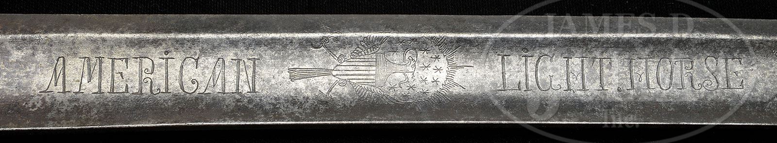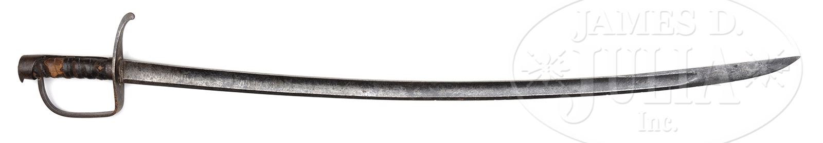 AMERICAN LIGHT HORSE HORSEMAN’S SABER. Classic Federal period (1790-1800) American Horseman saber with iron stirrup hilt and iron backstrap with 35-1/2″ blade etched with Heraldic American eagle and “AMERICAN LIGHT HORSE”. This sword very closely conforms to official regulation cavalry swords adopted by the U.S. Army in 1787 according to Harold Peterson in his classic text The American Sword originally published in 1954. This is a nice orig example of this pattern with beautiful markings, as can be seen in photos. PROVENANCE: William Guthman collection. CONDITION: Good overall. Blade markings are fine and easily discernible. Iron hilt appears “as found”, being dark brown w/light salt & pepper pitting. Grips retains about 60% orig leather; missing its orig wire though small pieces are still retained under backstrap. 4-48312 (3,500-5,000)