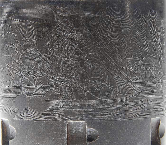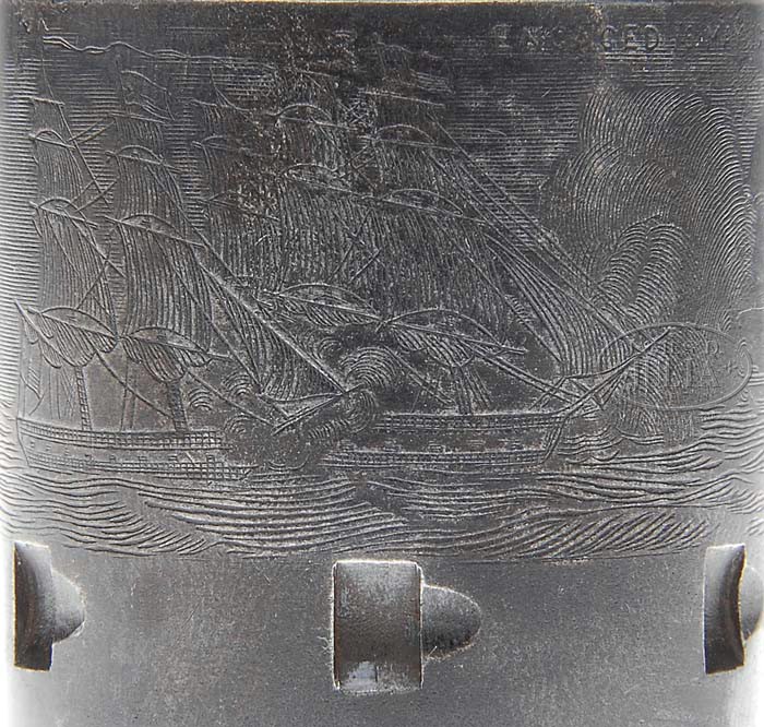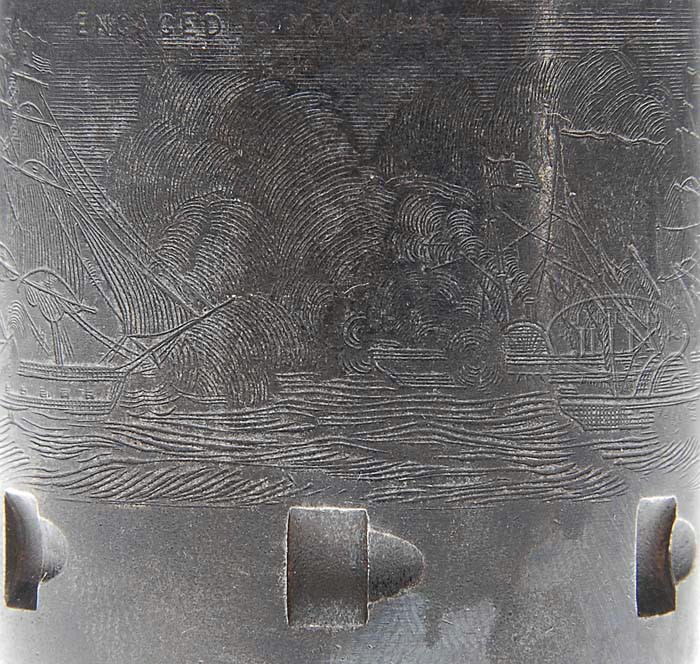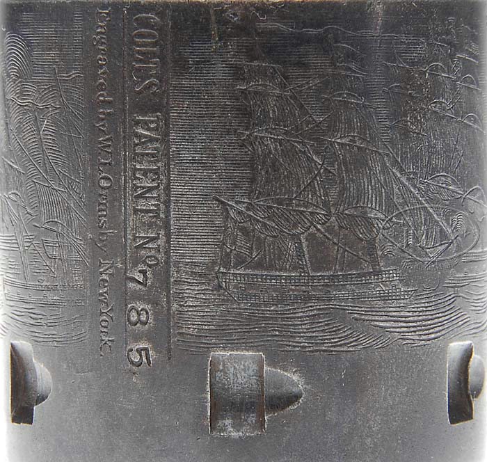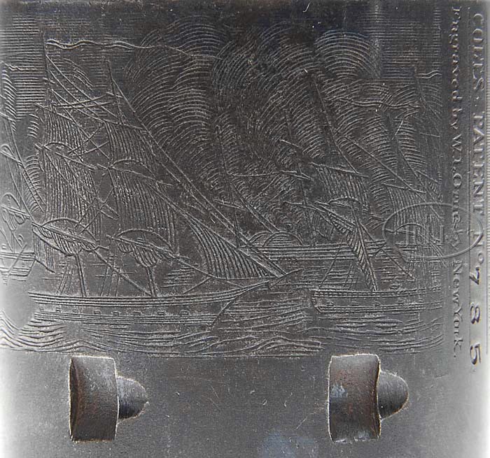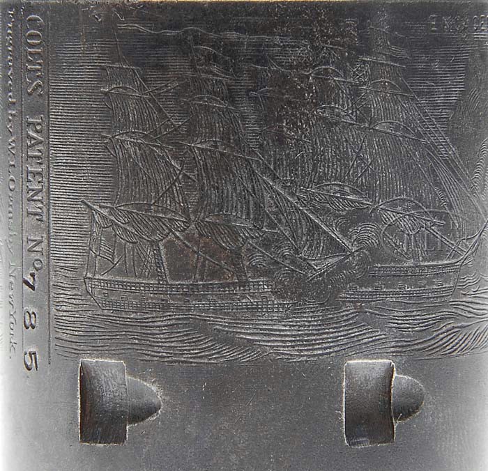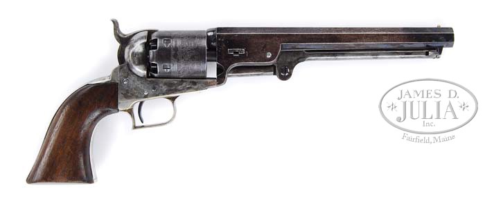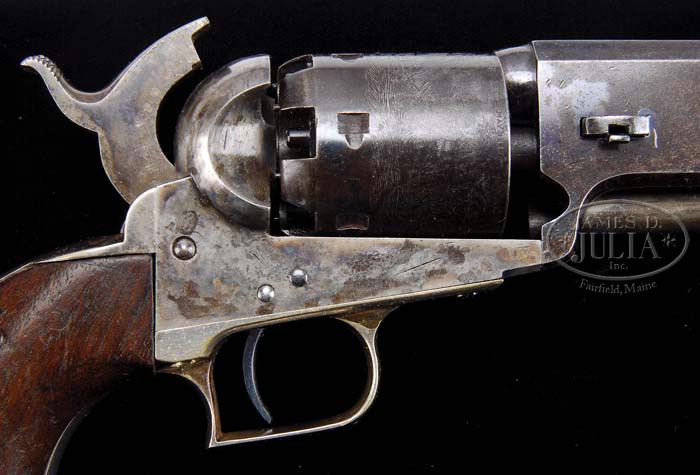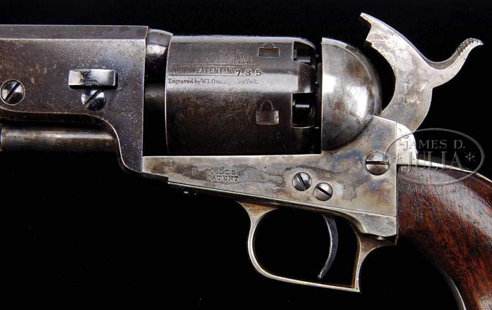 EXTREMELY RARE COLT FIRST MODEL 1851 NAVY PERCUSSION REVOLVER. SN 785. Cal. 36. Usual configuration with 7-1/2″ oct bbl, brass cone front sight and 1-line New York City address with dashes. Left side of frame is marked “COLT’S PATENT”. It has the small silver plated brass square-back trigger guard and back-strap containing a 1-pc walnut grip that has an inlaid silver maple leaf on left side. Wedge is typical of the first model with the screw beneath the wedge and cylinder pin wedge notch in the top. Cylinder is usual six chambers with Ormsby Naval battle scene and six crisp safety pins. According to Flayderman’s Guide to Antique American Firearms and other publications only about 1,250 of these rare revolvers were produced in 1850. This model was an immediate hit with its ease of portability and reasonable stopping power. The Model 1851 was extremely popular on the frontier during the great Westward expansion and then during the Civil War with both the Union and Confederacy. Genuine First Model Navys are rarely encountered today with most being housed in private collections and museums and of those very few retain any orig finish. PROVENANCE: Col. Kenneth P. Brown Collection. CONDITION: Very fine to extremely fine, all matching including rammer & cylinder (grip number was indecipherable). Barrel retains 30-40% orig blue, strong around the muzzle end, with patches of blue around breech end with balance flaked, not worn, to a medium dark patina. Rammer & rammer handle retain most of their orig case colors, moderately to heavily faded. Frame & hammer retain most of their fading case colors, strong in sheltered areas. Cylinder is a dark plum blue patina with light edge wear and retains 96-98% strong Ormsby Naval battle scene. All six safety pins are crisp. Trigger guard & back-strap retain about all of their orig silver plating. Grip is sound showing light wear on right lower edge with a sharp edge on left side and retains virtually all of its orig oil finish with a hand worn patina. Mechanics are crisp, bright shiny bore with scattered pitting. 4-39436 JR92 (25,000-40,000)