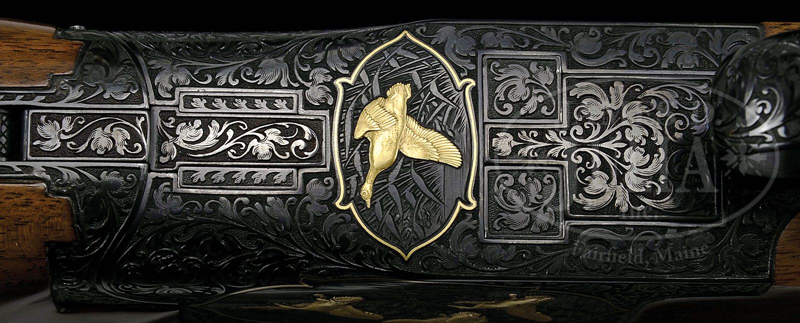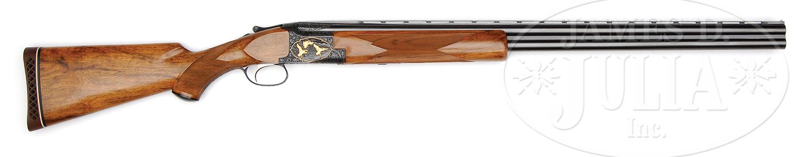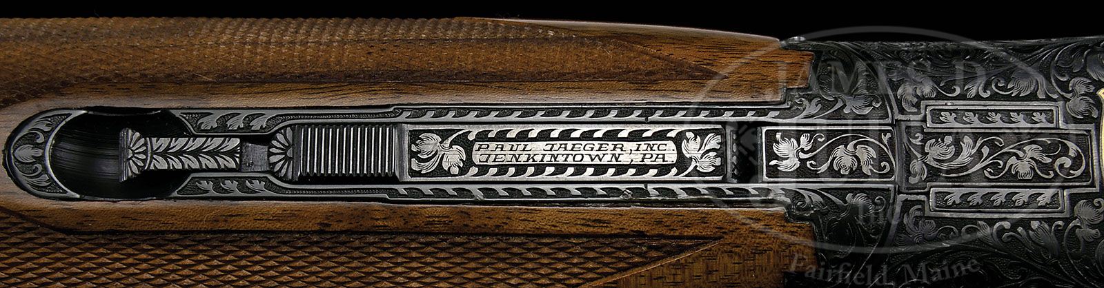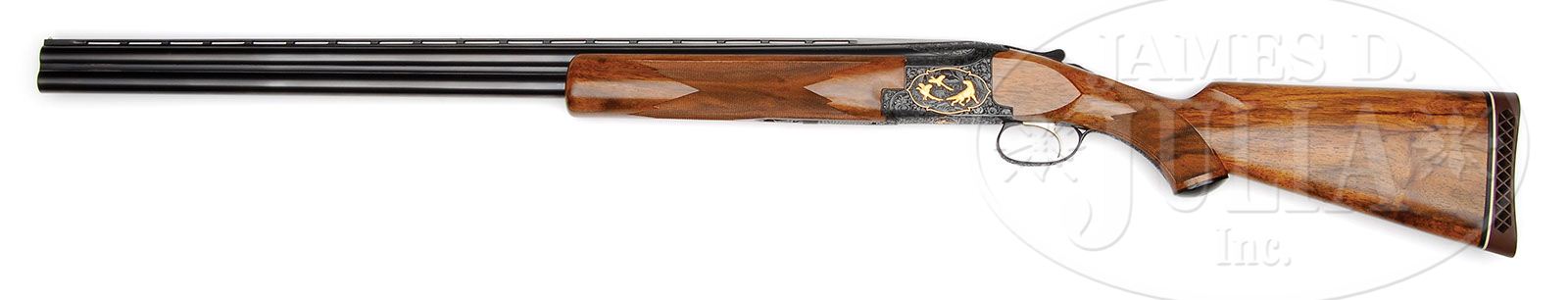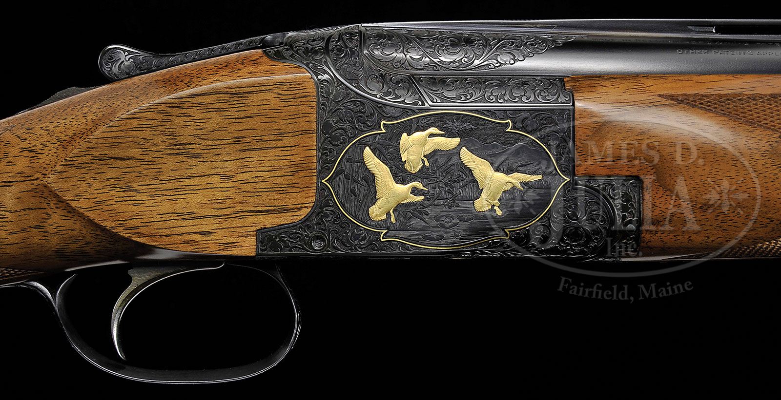 *NICELY APPOINTED GOLD INLAID BROWNING SUPERPOSED CUSTOM BY JAEGER. SN 16180. (ca 1939) Cal. 12 ga. 30″ Bbls are choked modified and full and have pre-war St. Louis, MO address on left side of top bbl. Consignor states: “Gun was upgraded by Paul Jaeger with finest 3-dimension gold inlays.” Factory invoice relates the gun was originally a standard model, grade 1. Takedown latch is engraved “PAUL JAEGER INC” “JENKINTOWN, PA”. The Jaeger upgrade consists of nicely figured French walnut stocks with point pattern checkering and with full coverage engraving and gold inlaid vignettes on blued action. This is in the style of the finest special order Browning engraving available, reminiscent of that found on Midas grade guns, with exceptionally well cut and well shaded acanthus scroll spilling onto breech end of bbls, framing vignettes of dogs and birds surrounded by gold wire. A setter watches flushing pair of ring-necked pheasants in open woodlands on left side; a trio of ducks settling into marsh is on right; bottom of action limns goose in flight with reeds in background. The quality of this work is truly exceptional, however no engravers signature can be found. Bore diameter: top -.728, bottom -.724. Bore restrictions: top -.036, bottom -.025. Wall thickness: top-.026, bottom -.032. Drop at heel: 1-5/8″, drop at comb: 1-5/16″. Weight: 7 lbs. 7 oz. LOP: 14-1/2″. Brown Browning leatherite case is lined in brown faux fur, and contains an envelope with two keys. PROVENANCE: Factory letter and copy of invoice confirming configuration of the orig gun. CONDITION: Excellent, appears unfired since upgrade, retaining essentially all of its satin rust blue on bbls, with only minor marks from assembly and dis-assembly. All blue remains on action and trigger guard. Stocks retain essentially all of their rubbed oil finish with some minor, almost invisible, light marks and compressions. Bores are excellent. Action is crisp. Case is excellent. 4-47522 MGM71 (6,000-9,000)