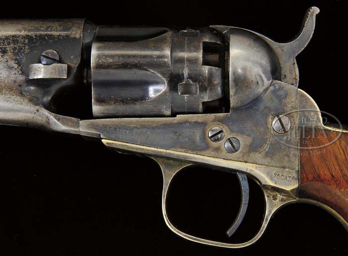 SCARCE IDENTIFIED COLT MODEL 1862 POLICE PERCUSSION REVOLVER. SN 6127. Cal. 36. Blue & color case hardened with 6-1/2″ bbl, brass pin front sight and 1-line address. Left side of frame has “COLTS PATENT” and left shoulder of trigger guard has with caliber . It has usual 5-shot rebated, fluted cyl and the silver plated trigger guard & backstrap contain a 1-pc walnut grip with the matching SN in backstrap channel. Backstrap channel also has the hand written inscription “S L HART” and opposite “10 REGT”. Bottom right edge of grip, beside buttstrap, is hand scratched “HART CO. C 10 REG” and on the opposite grip are some illegible notations. Accompanied by a Civil War period black leather flap holster which is hand lettered on inside of flap “S.L. HART”. Samuel Lombard Hart was born in New York and moved to Menasha, Wisconsin in about 1850 where he worked with his father as a gunsmith. He enlisted as a 2nd Lieutenant in Company C Wisconsin 10th Infantry on July 18, 1861 and resigned on Sept. 14, 1862. He re-enlisted as a Captain in Company D Wisconsin 41st Infantry on June 9, 1864 and was mustered out on Sept. 23, 1864 (One of the 100-day troops). According to family history Capt. Hart served as the signals officer for the 4th Division Army of the Tennessee and saw action in the battles at Pittsburgh Landing, The Siege of Corinth and Forrest’s Raid into Memphis. It was during the Memphis raid where, under orders of Gen. Nelson, Capt. Hart crossed the river at Pittsburgh, landing under heavy fire, bearing dispatches to Gen. Buell. Upon being mustered out of the Army Samuel Hart and his brothers settled in Tombstone, AZ where they opened the Hart Gun Shop on Fremont Street. They were present during the fight at the OK Corral although not participants. Very likely they would have supplied arms & ammunition to the participants. This revolver has passed down through the descendants of Capt. Hart to the current family member/consignor. CONDITION: Fine to very fine, all matching including wedge, bbl & grip. Bbl retains 25-30% glossy orig blue with balance flaked & worn to gray metal patina; rammer pivot retains moderately faded case colors with the handle gray patina; frame retains strong, bright case colors on sides, fading to silver on recoil shields; hammer retains strong case colors on sides & rear edge, moderately faded on top; trigger guard & backstrap retain about 80% orig silver; cyl retains 70-75% orig blue, strong & bright in the flutes and part of rebated area worn to metal elsewhere; grip is sound showing light to moderate wear on edges and overall retains most of its orig factory varnish. Mechanics are crisp, very bright shiny bore. Holster has an open seam, otherwise is fine with crackled surface and overall retains most of its orig black finish; belt loop is repaired at top fold. 4-45026 JR374 (4,000-6,000)