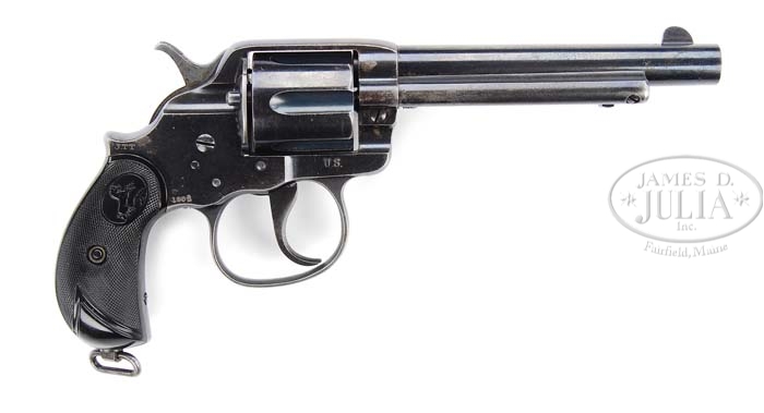 *SCARCE COLT MODEL 1902 ALASKAN DA REVOLVER. SN 47543. Cal. 45 Colt. Blue finish with 6″ bbl, full front sight, 1-line block letter address and caliber marking on left side. Lower left rear side of frame has the rampant Colt in a broken circle with “RAC” (Rinaldo A. Carr) inspector initials on the upper left rear side of frame and on left front web of trigger guard. Right side of frame is stamped “U.S.” under cyl opening, the model number “1902” on the lower rear and “J.T.T” (John T. Thompson) inspector initials on upper rear side. Cyl has the last four digits of SN on rear face between two chambers and “RAC” inspector initials between two others. Mounted with rampant Colt hard rubber grips. Buttstrap is mounted with a lanyard stud & loop. This model of the 1878 DA revolver is referred to as the “Alaskan” or “Philippine” model with only about 4,600 produced under the 1902 contract. Their extremely large trigger guard and commensurately long triggers were ostensibly to permit troops wearing heavy gloves to fire this revolver without having to remove their glove. CONDITION: Very fine. Overall retains 93-95% strong orig blue, especially on the bbl, thinning on rear edges of frame & grip frame. Cyl retains 95-97% glossy orig blue. Grips show very minor, light diamond point wear with a small bruise on each side. Mechanics are fine, brilliant shiny bore. 4-38610 JR273 (4,000-6,000)