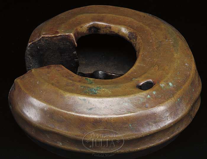 KPELLE BRASS ANKLE SHACKLE. 18th century, Northern Sudan (now known as Liberia). This authentic casting of an ankle shackle, the purpose of which is purported to have been used as a shackle placed on the ankle of a paramount chief’s first or favored wife. This was an accepted practice in the early 18th century in the Kpelle tribe. This unusual and rare example was acquired by a missionary active in the area from 1955-1963 from a tribal clan chief as part of the Sudan Interior Mission. These anklets or shackles were made by individuals within the Kpelle tribe from a brass “bucket” or “kettle” that were given to tribesmen as payment for the turning over of captured individuals from other tribes. In essence, selling the prisoner to Westerners for transport on slave ships in the Atlantic slave trade. The leg piece was originally modeled out of bee’s wax, covered with mud, baked and hardened. The brass pieces were then melted and the liquid poured into the hardened clay mold. SIZE: 8″ exterior dia. PROVENANCE: As noted in description. Accompanied by a signed statement from the current owner. CONDITION: With old surfaces and patina. Crack at midpoint resulting from the opening of the shackle. 9-25467 (7,500-10,000)