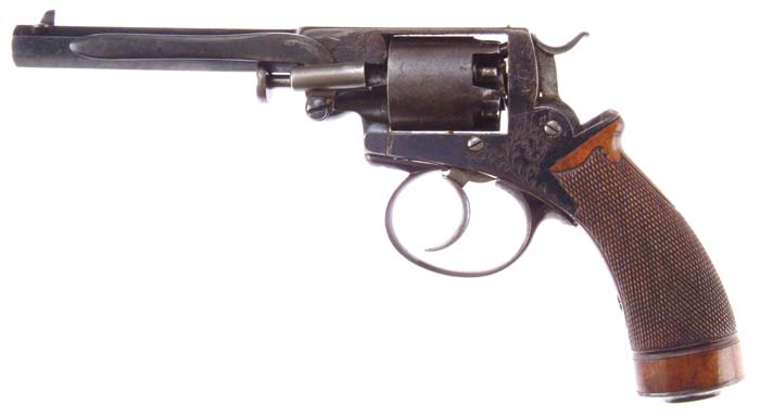ENGRAVED ADAMS PATENT DOUBLE ACTION PERCUSSION REVOLVER. Cal. 36. SN 30. Blue finish with 5-1/4” oct bbl, dovetail front sight and fixed rear sight. It has 5-shot cyl with left side rammer. It is fitted with checkered 1-pc walnut grip. Frame & bbl lug are lightly engraved with foliate arabesque patterns with matching patterns on trigger bow & butt cap. Accompanied by a green felt lined, leather covered, homemade case compartmented for the revolver, a wood handled nipple wrench, an all metal cleaning jag an orig 2-cavity bright steel mold with sprue cutter and a homemade brass powder flask. There is also a scarce glass topped cap tin. CONDITION: Fine plus. Revolver is double action only and retains about 85% thinning glossy orig blue with the loss areas flaked to a light patina. Cyl is a thin blue patina with the nipples hammered flat. Grip is sound showing light wear and retains most of its orig varnish. Mold is bright metal with mottled surface stains. Jag is fine. Box has a broken hinge and shows heavy wear with dry crackled surface. 4-30518 JR512 (1,000-1,500)