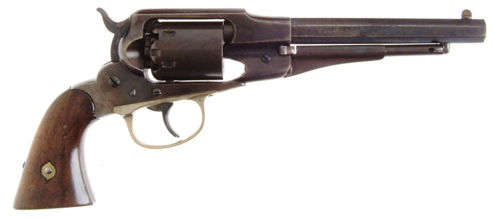 REMINGTON DOUBLE ACTION BELT MODEL REVOLVER. Cal. 36 Perc. SN 2441. Blued finish, 6-3/8” oct bbl with two line bbl marking, listing two of Riders’ patents. Pinched front sight, silvered brass triggerguard, 2-pc smooth walnut grips. There is an “E” on left side of triggerguard & a “W” on cyl. Revolver was apparently made after Civil War & used double action war time bbl since markings are “REMINGTONS’” which was the markings on bbls of early double action fluted cylinder revolvers. It appears orig bbl number was “111” and was re-stamped “2441” by Remington. The double action of this revolver is working condition, which is not common to these DA belt models. CONDITION: Good. Strong traces of orig blue on bbl, enhanced finish on frame, cyl, & loading lever. Triggerguard has about half the silver remaining. Grips have been refinished over worn spots. 4-59401 JH94 (750-1,250)